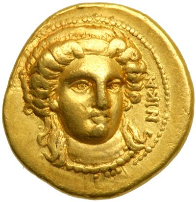 An exquisite Greek coin type, issued around 330 BC, this rare coin was struck to pay mercenaries during the period that Alexander the Molossian came to the rescue of Magna Graecia. Most of the existing examples of this and other associated gold issues are from the Bernalda hoard, discovered in 1935 (IGCH 1958).