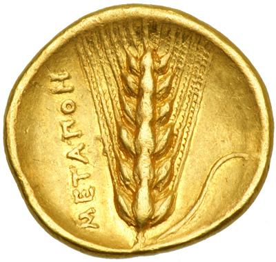 Lucania, Metapontion, c. 330 BC. Gold Third Stater, or Euboic-Attic Tetrobol (2.62 g)