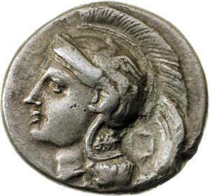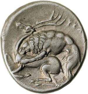 Mondo Greco. Italia Greca. Lucania,Velia. Nomos, 440-400 a.C. D/ Testa di Athena a sinistra, che indossa elmo attico decorato con grifone. R/ YEΛ[ ]. Leone che attacca un cervo a sinistra. HNI (Italy) 1270. AG. g. 7.36 mm. 22.00 Bel BB+/qSPL. Perfettamente centrato su grande flan, con delicata patina di monetiere.
