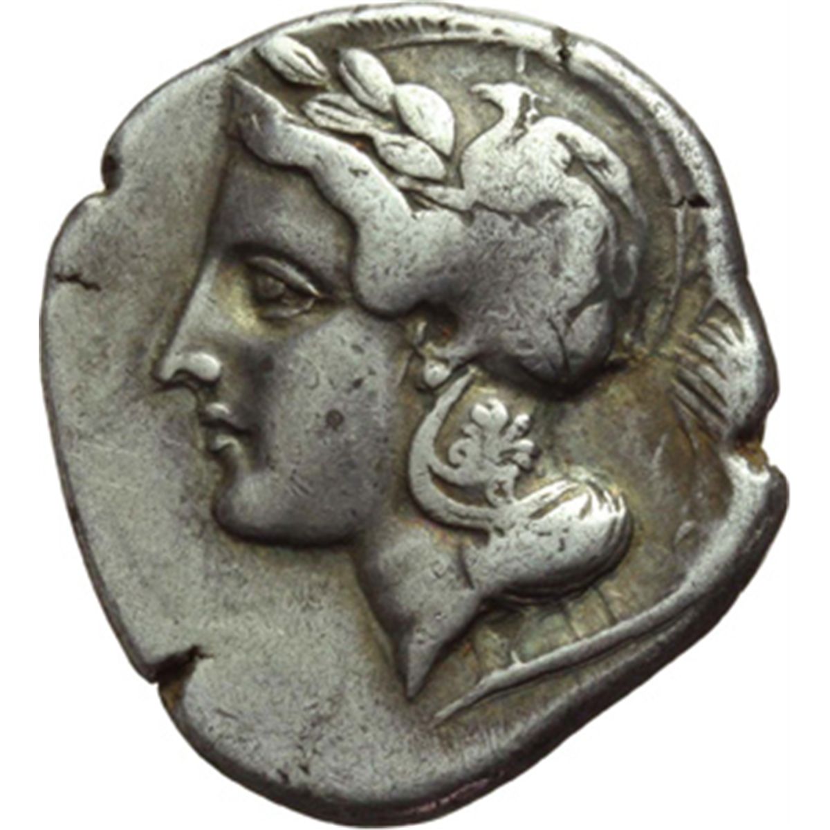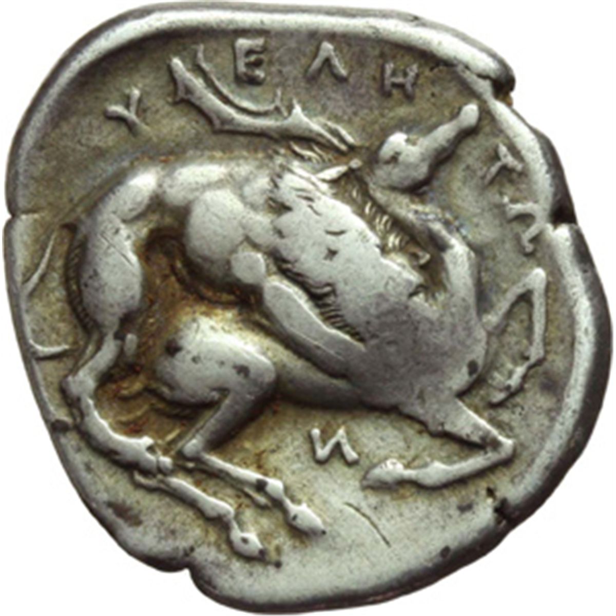 Mondo Greco. Italia Greca. Lucania, Velia. Nomos, 450-400 a.C. D/ Testa di Athena a sinistra, che indossa elmo attico laureato. R/ YEΛΗTΩN. Leone che attacca un cervo a destra. SNG ANS 1248. AG. g. 7.57 mm. 23.00 Bel BB.