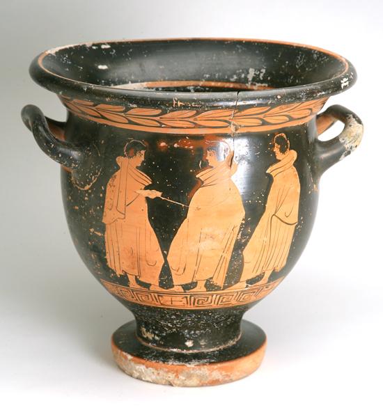 Lucanian Red-Figured Bell Krater. Circa 400 B.C. The obverse with a nude gesticulating satyr running to the right, his left leg raised, his arms outstretched, with short curly hair and long beard, characteristic pointy ears and pug nose, a maenad before him, moving right and looking back with short curly hair draped in a chiton; another maenad standing behind him facing left, draped in a himation over a chiton. The reverse with three draped youths; meander with saltire squares below the scenes, laurel below the rim. Intact, some minor repairs. Height 10½".