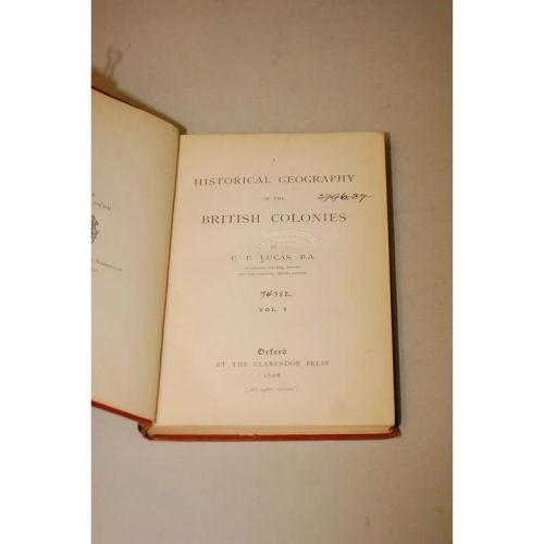 Lucas, C.P.. A Historical Geography of the British Colonies. Oxford: Clarendon Press, 12mo - over 6¾" - 7¾" tall. Hard Cover. Ex-Library. Good Condition. 1887-1907. 7 books. ***Introduction to a Historical Geography of the British Colonies, complete with 8 maps. ***Volume I - Complete with 11 maps. ***Volume III - West Africa, complete with 5 maps. ***Volume IV - South & East Africa, complete with 3 maps. ***Volume V, Part I - Canada, complete with 4 maps (2 folding, one of which has a closed tear and is detached). ***Volume V, Part II - Canada Historical, by Hugh E. Egerton, complete with 10 maps. ***Volume VI - Australasia by J.D. Rogers, complete with 5 maps (1 folding). Lacks vol. II, first two books bound in original maroon cloth, others in original green cloth. Bindings tight.