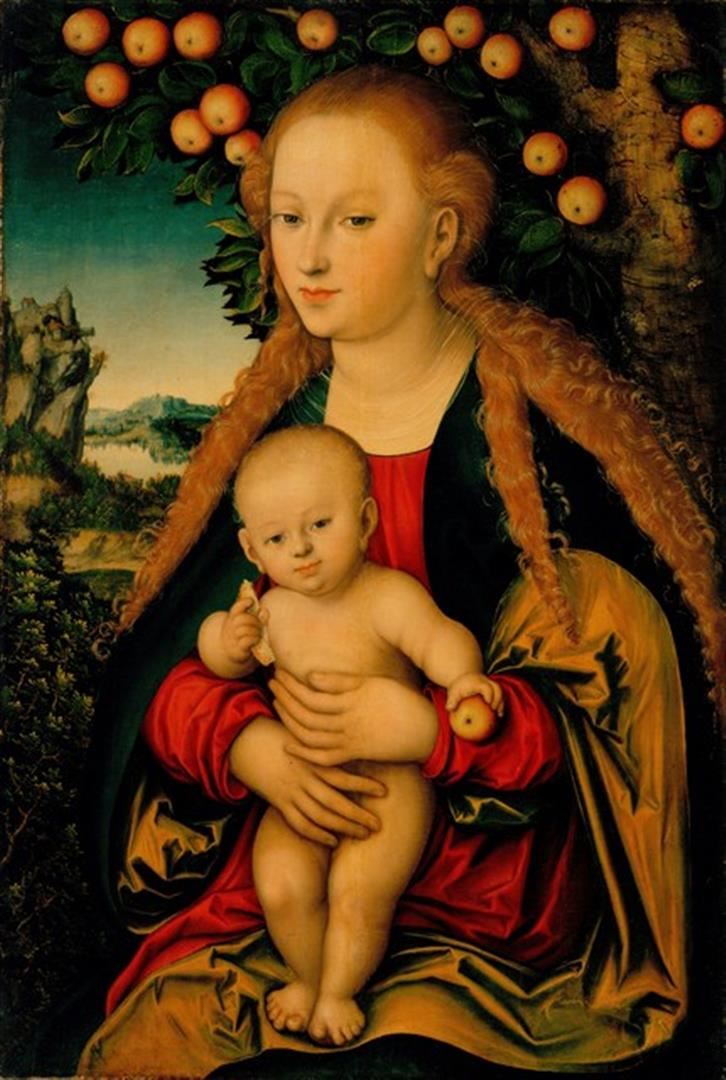 Artist: Lucas Cranach - Title: The Virgin and Child Under an Apple Tree - Medium: Fine Art Reproduction Giclee on Canvas - Image Size: Approximately 32 inches x 21.5 inches - Unframed on Unstretched Canvas - Biography: Lucas Cranach was a German Renaissance painter and printmaker in woodcut and engraving. He was court painter to the Electors of Saxony for most of his career, and is known for his portraits, both of German princes and those of the leaders of the Protestant Reformation, whose cause he embraced with enthusiasm. He was a close friend of Martin Luther. Cranach also painted religious subjects, first in the Catholic tradition, and later trying to find new ways of conveying Lutheran religious concerns in art. He continued throughout his career to paint nude subjects drawn from mythology and religion.