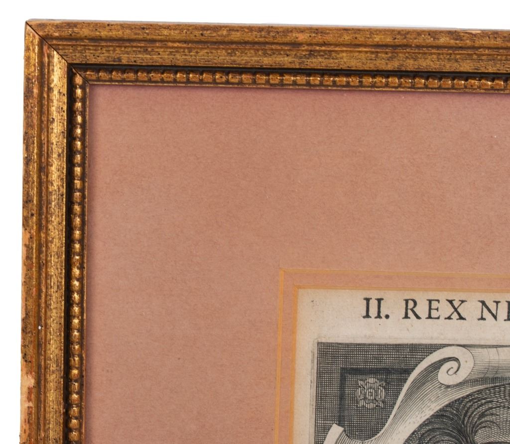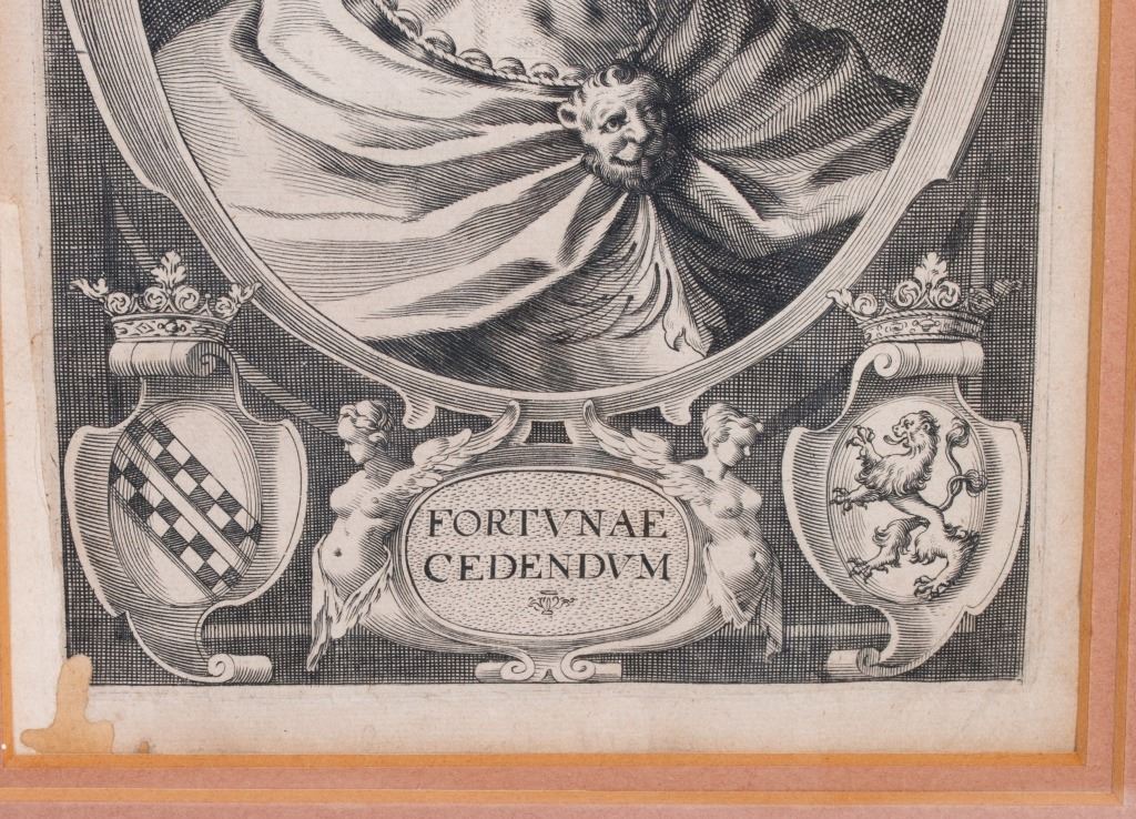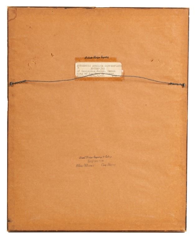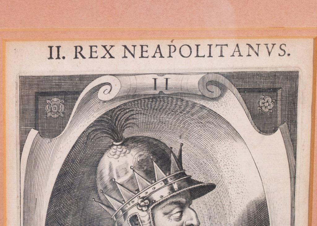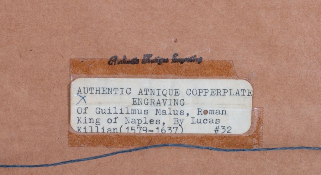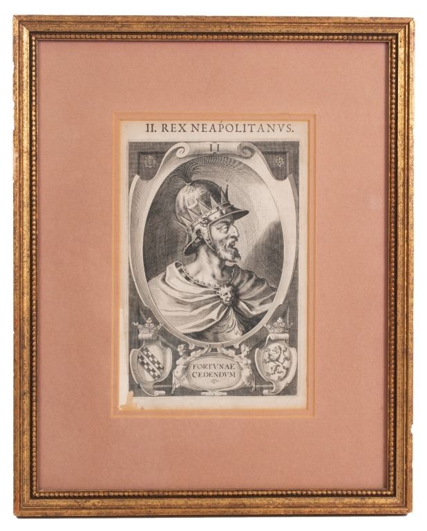 Item/Description: Antique copperplate engraving by Lucas Kilian. Image features profile portrait of an Italian King. Reads: II. REX NEAPOLITANUS. / FORTUNAE CEDENDUM. (fortunae cedendum translates to: must yield to fortune). Reads in part on back adhered label: Guilimus Malus, Roman King of Naples.