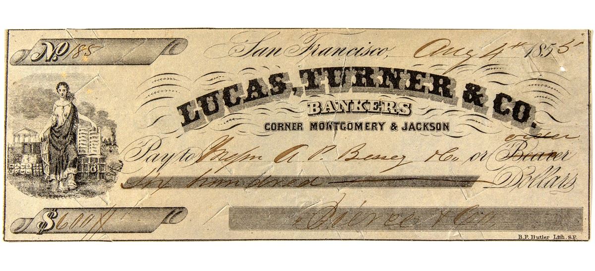 Number 185 issued on August 4, 1855 for $600 to Mssr A. P. Bessey & Co. Signed by Pierce & Co. (Pierce was a receiving company so this was most probably for a steamship consignment.) Endorsed on reverse, Vignette of woman with ledger book and shipment of goods.