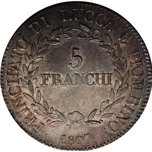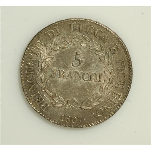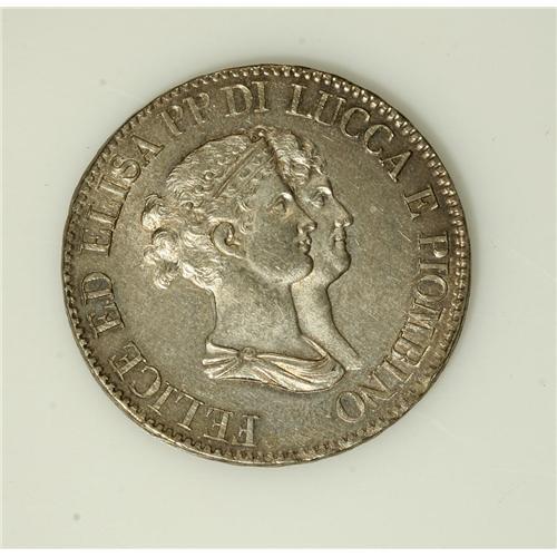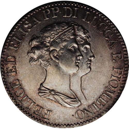 <B>Lucca. Felix & Elisa 5 Franchi 1807, </B></I>KM24, superb AU-UNC, lightly toned with full underlying luster. An extremely handsome example rarely seen in this superior quality.<BR><BR><b>Shipping:</b> Coin/Currency (<a target="_blank" href="http://www.heritageauctions.com/common/shipping.php">view shipping information</a>)