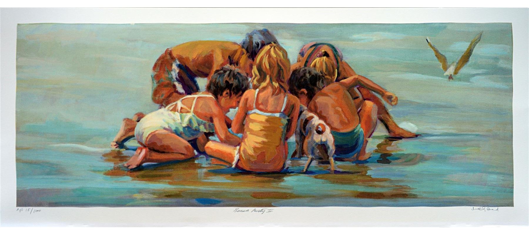 Artist: Lucelle Raad (b. 1942)  - Title:  Beach Party IV - Medium: Serigraph on Fine Art Paper - Signature: Hand-signed by the Artist  - Limited Edition: AP 100 - Image Size: Approximately 11.5 Inches x 30.5 inches  - Paper Size: Approximately 13.5 inches x 32.5 inches - Framed: Unframed - Details: This work comes with a Certificate of Authenticity - Biography: Many are touched by Lucelle's blending of the hopeful innocence of children in a commonplace setting. Each case awakens nostalgia for that youthful honesty and simplicity in all that view her work. The recipient of multiple awards, her most prized award was received at the world famous Washington Square Art Exhibit, an annual event in New York which is an invitational, juried show with over 500 artists from every corner of the globe. Lucelle's art graces many corporate, public, and private collections in every state in the union and in countries around the world.