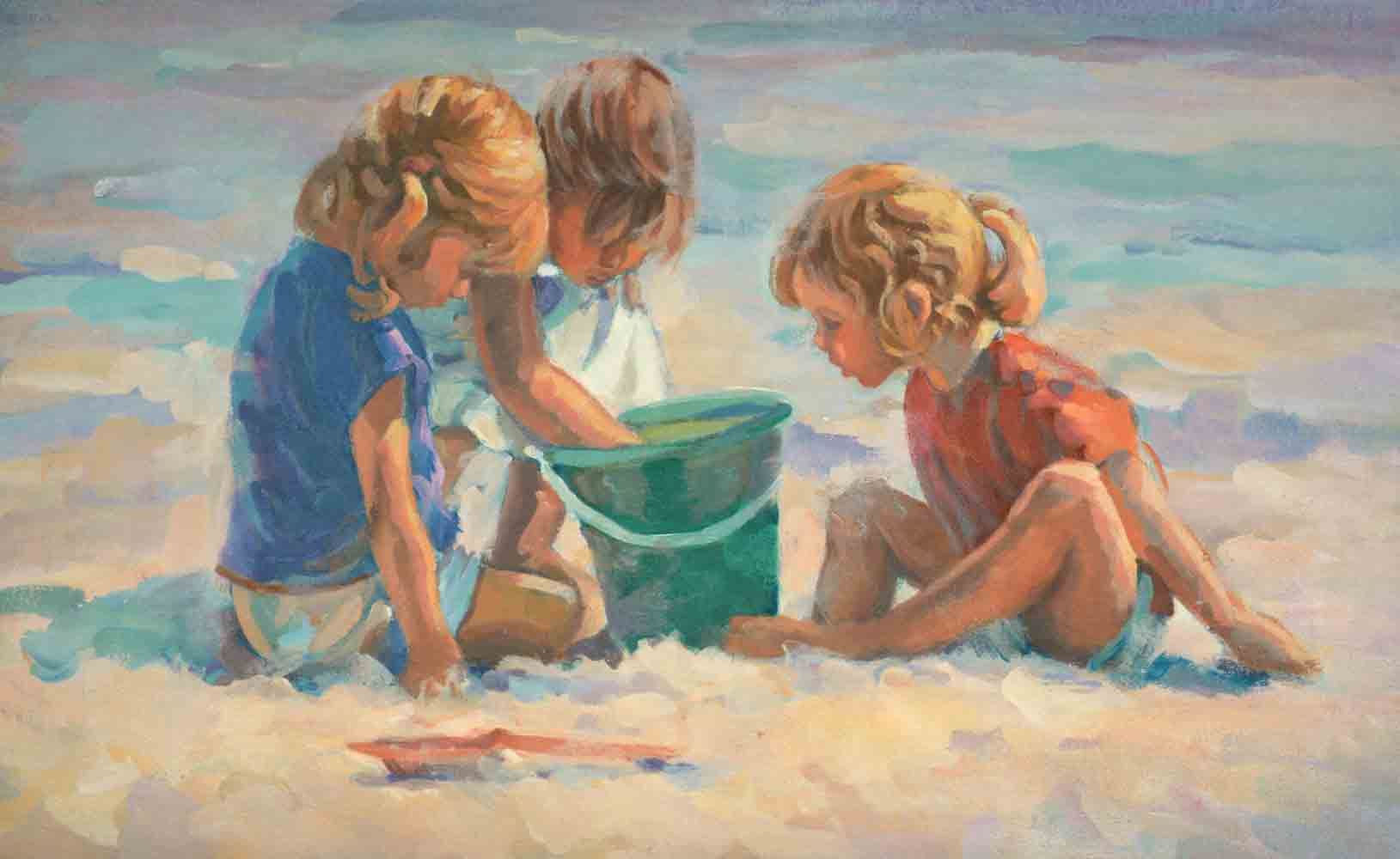 Artist: Lucelle Raad (b. 1942) - Title: Curiosity - Medium: Serigraph on Fine Art Paper - Signature: Hand-signed by the Artist - Limited Edition: AP 50 - Image Size: Approximately 15.75 inches x 25 inches - Paper Size: Approximately 21 inches x 28.5 inches - Framed: Unframed - Details: This work comes with a Certificate of Authenticity - Biography: Many are touched by Lucelle's blending of the hopeful innocence of children in a commonplace setting. Each case awakens nostalgia for that youthful honesty and simplicity in all that view her work. The recipient of multiple awards, her most prized award was received at the world famous Washington Square Art Exhibit, an annual event in New York which is an invitational, juried show with over 500 artists from every corner of the globe. Lucelle's art graces many corporate, public, and private collections in every state in the union and in countries around the world.