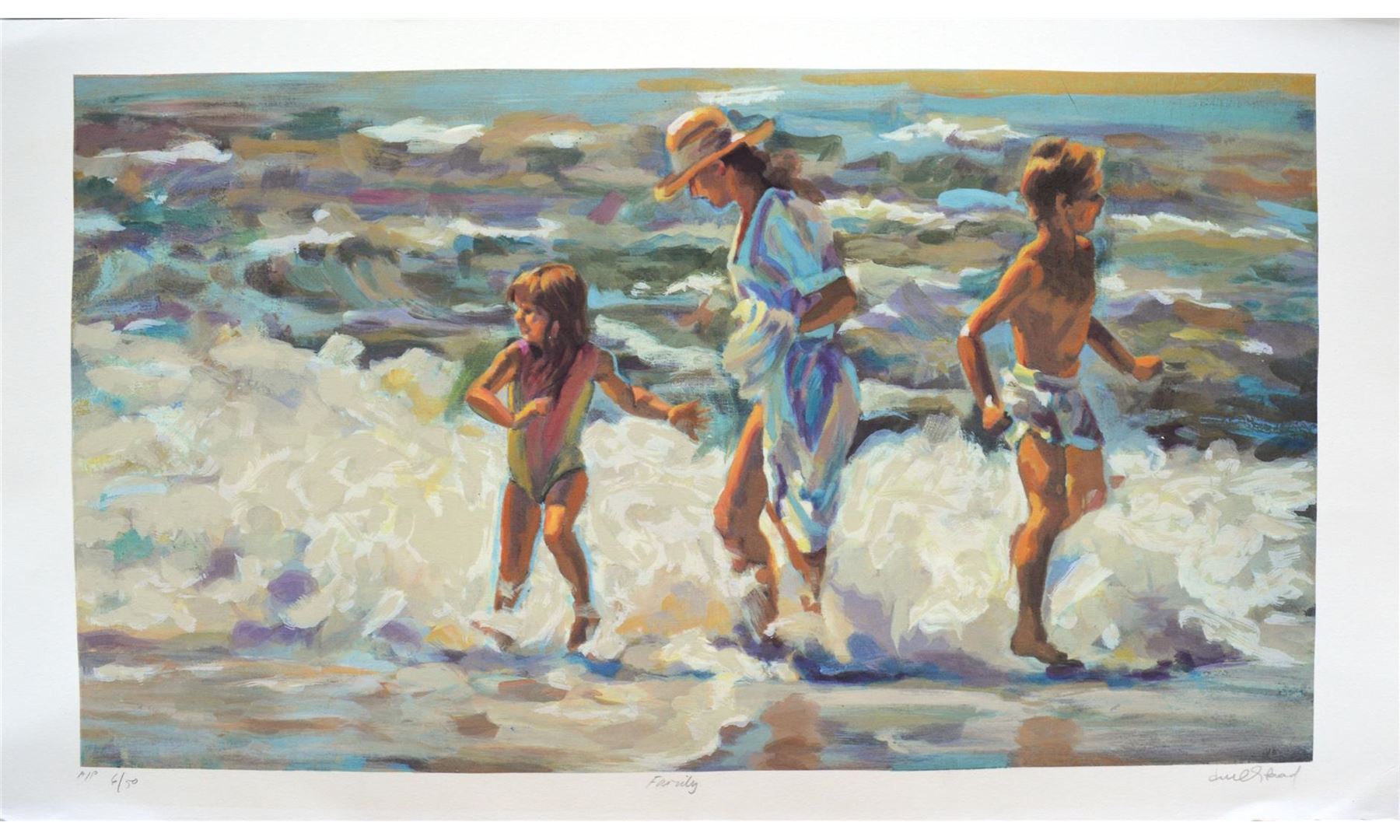 Artist: Lucelle Raad (b. 1942) - Title: Family - Medium: Serigraph on Fine Art Paper - Signature: Hand-signed by the Artist - Limited Edition: AP 50 - Image Size: Approximately 12 Inches x 21 inches - Paper Size: Approximately 14 inches x 24.5 inches - Framed: Unframed - Details: This work comes with a Certificate of Authenticity - Biography: Many are touched by Lucelle's blending of the hopeful innocence of children in a commonplace setting. Each case awakens nostalgia for that youthful honesty and simplicity in all that view her work. The recipient of multiple awards, her most prized award was received at the world famous Washington Square Art Exhibit, an annual event in New York which is an invitational, juried show with over 500 artists from every corner of the globe. Lucelle's art graces many corporate, public, and private collections in every state in the union and in countries around the world.