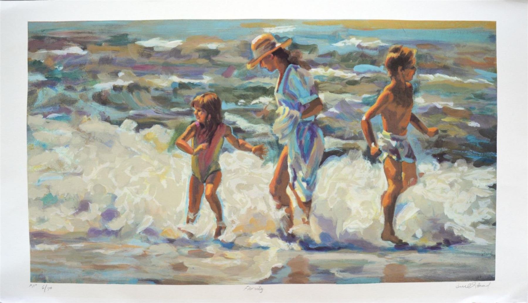 Artist: Lucelle Raad (b. 1942) - Title: Family - Medium: Serigraph on Fine Art Paper - Signature: Hand-signed by the Artist - Limited Edition: AP 50 - Image Size: Approximately 12 Inches x 21 inches - Paper Size: Approximately 14 inches x 24.5 inches - Unframed - Details: This work comes with a Certificate of Authenticity - Biography: Many are touched by Lucelle's blending of the hopeful innocence of children in a commonplace setting. Each case awakens nostalgia for that youthful honesty and simplicity in all that view her work. The recipient of multiple awards, her most prized award was received at the world famous Washington Square Art Exhibit, an annual event in New York which is an invitational, juried show with over 500 artists from every corner of the globe. Lucelle's art graces many corporate, public, and private collections in every state in the union and in countries around the world.