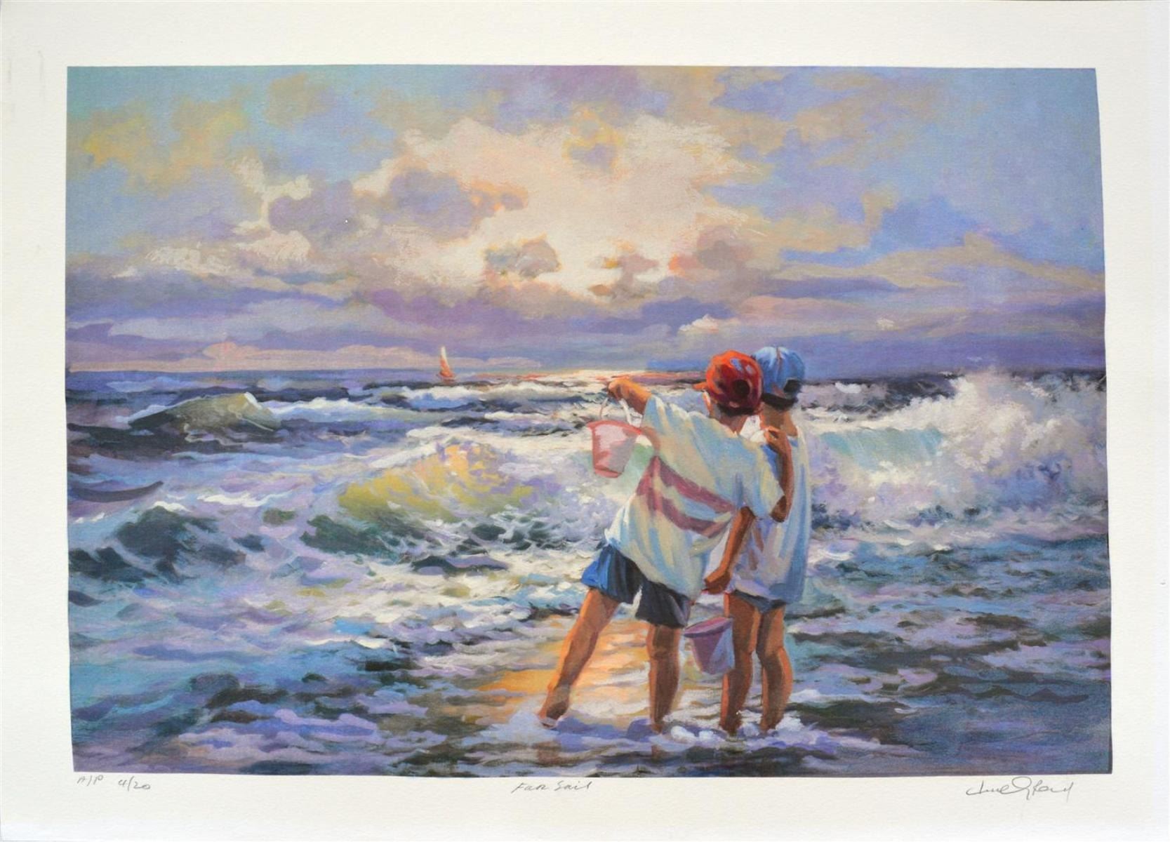 Artist: Lucelle Raad (b. 1942) - Title: Far Sail - Medium: Serigraph on Fine Art Paper - Signature: Hand-signed by the Artist - Limited Edition: AP 20 - Image Size: Approximately 11.5 Inches x 17.5 inches - Paper Size: Approximately 14 inches x 20 inches - Framed: Unframed - Details: This work comes with a Certificate of Authenticity - Biography: Many are touched by Lucelle's blending of the hopeful innocence of children in a commonplace setting. Each case awakens nostalgia for that youthful honesty and simplicity in all that view her work. The recipient of multiple awards, her most prized award was received at the world famous Washington Square Art Exhibit, an annual event in New York which is an invitational, juried show with over 500 artists from every corner of the globe. Lucelle's art graces many corporate, public, and private collections in every state in the union and in countries around the world.