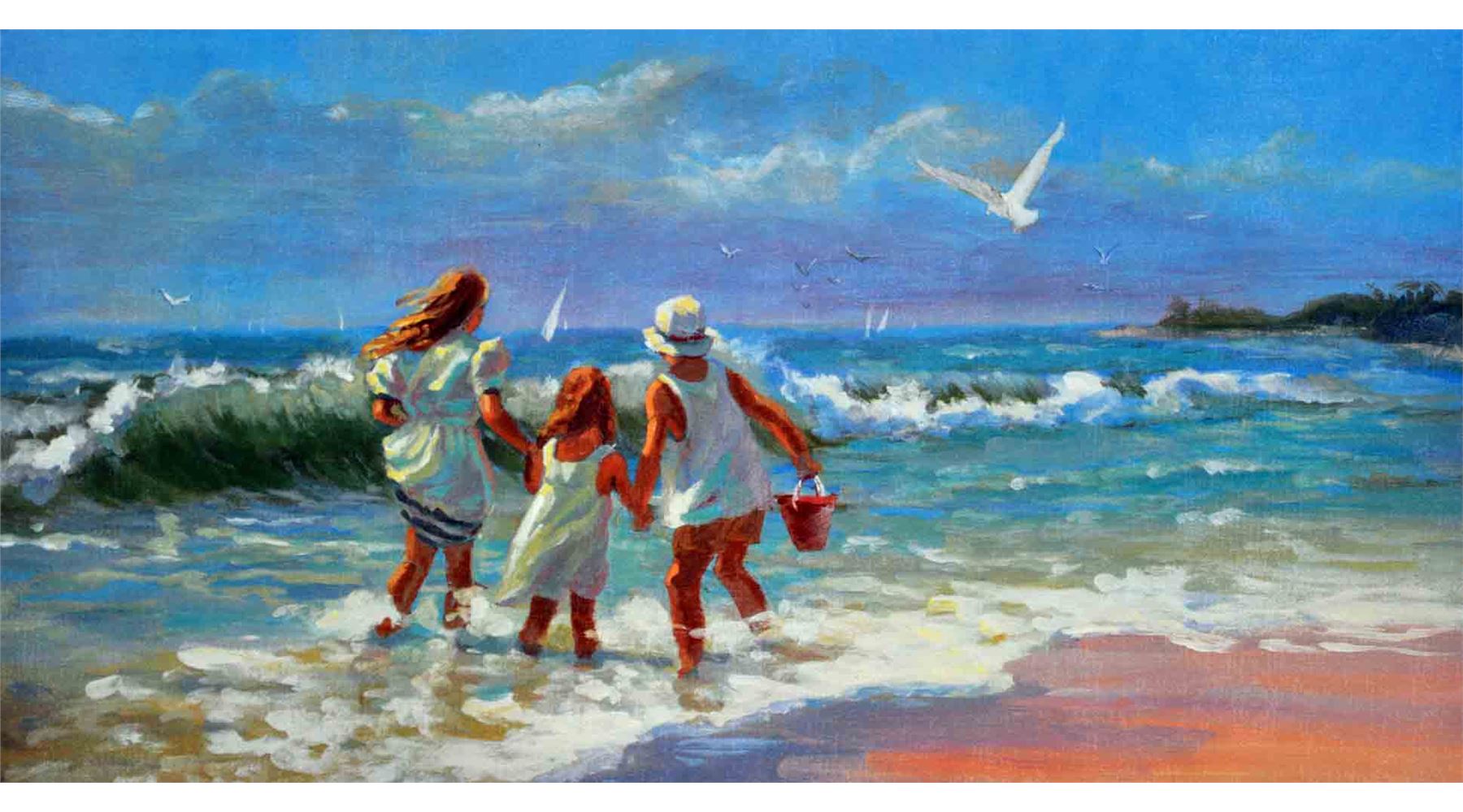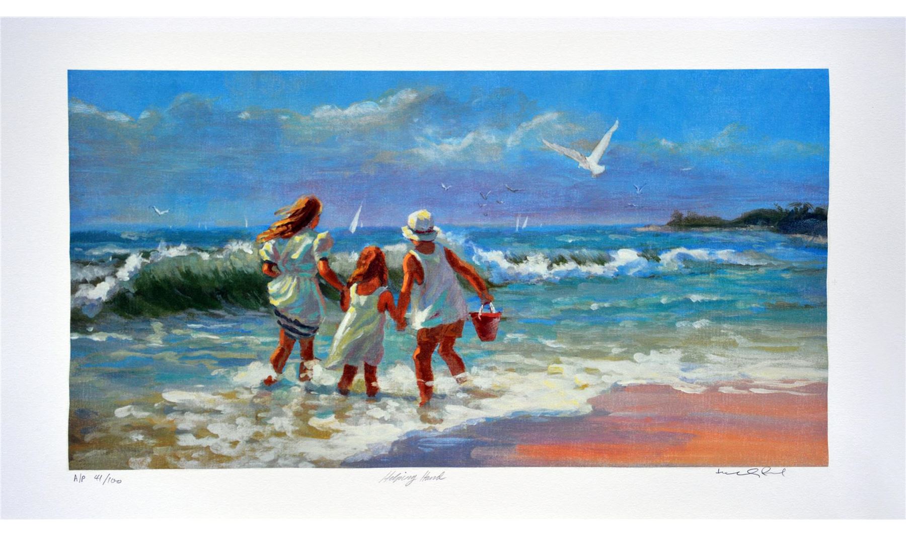 Artist: Lucelle Raad (b. 1942) - Title: Helpful Hand - Medium: Serigraph on Fine Art Paper - Signature: Hand-signed by the Artist - Limited Edition: AP 100 - Image Size: Approximately 11 Inches x 21.75 inches - Paper Size: Approximately 14.25 inches x 26 inches - Framed: Unframed - Details: This work comes with a Certificate of Authenticity - Biography: Many are touched by Lucelle's blending of the hopeful innocence of children in a commonplace setting. Each case awakens nostalgia for that youthful honesty and simplicity in all that view her work. The recipient of multiple awards, her most prized award was received at the world famous Washington Square Art Exhibit, an annual event in New York which is an invitational, juried show with over 500 artists from every corner of the globe. Lucelle's art graces many corporate, public, and private collections in every state in the union and in countries around the world.