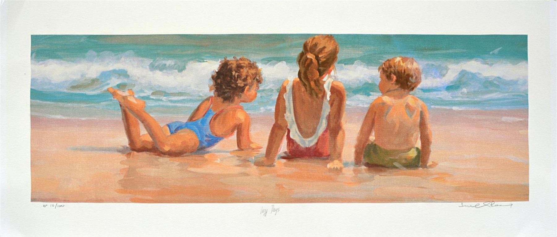 Artist: Lucelle Raad (b. 1942) - Title: Lazy Days - Medium: Serigraph on Fine Art Paper - Signature: Hand-signed by the Artist - Limited Edition: AP 100 - Image Size: Approximately 9 Inches x 25 inches - Paper Size: Approximately 13 inches x 28.5 inches - Framed: Unframed - Details: This work comes with a Certificate of Authenticity - Biography: Many are touched by Lucelle's blending of the hopeful innocence of children in a commonplace setting. Each case awakens nostalgia for that youthful honesty and simplicity in all that view her work. The recipient of multiple awards, her most prized award was received at the world famous Washington Square Art Exhibit, an annual event in New York which is an invitational, juried show with over 500 artists from every corner of the globe. Lucelle's art graces many corporate, public, and private collections in every state in the union and in countries around the world.