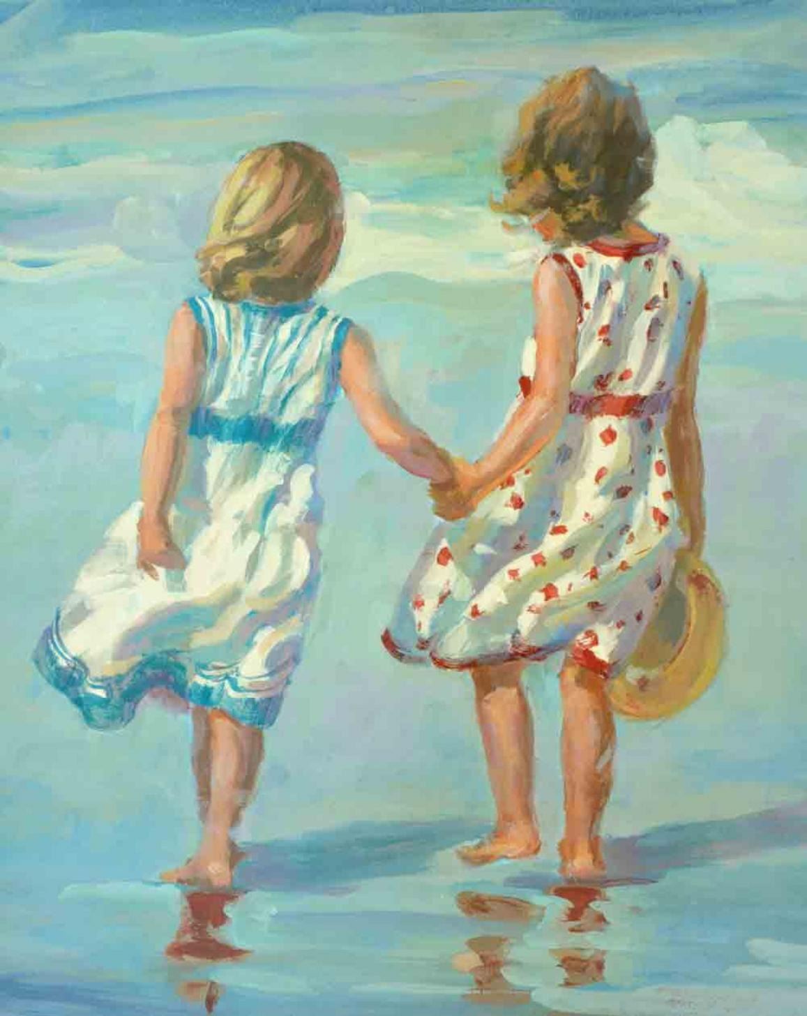 Artist: Lucelle Raad (b. 1942) - Title: Little Ladies - Medium: Serigraph on Fine Art Paper - Signature: Hand-signed by the Artist - Limited Edition: AP 125 - Image Size: Approximately 20.5 Inches x 16.5 inches - Paper Size: Approximately 23.5 inches x 19.5 inches - Framed: Unframed - Details: This work comes with a Certificate of Authenticity - Biography: Many are touched by Lucelle's blending of the hopeful innocence of children in a commonplace setting. Each case awakens nostalgia for that youthful honesty and simplicity in all that view her work. The recipient of multiple awards, her most prized award was received at the world famous Washington Square Art Exhibit, an annual event in New York which is an invitational, juried show with over 500 artists from every corner of the globe. Lucelle's art graces many corporate, public, and private collections in every state in the union and in countries around the world.