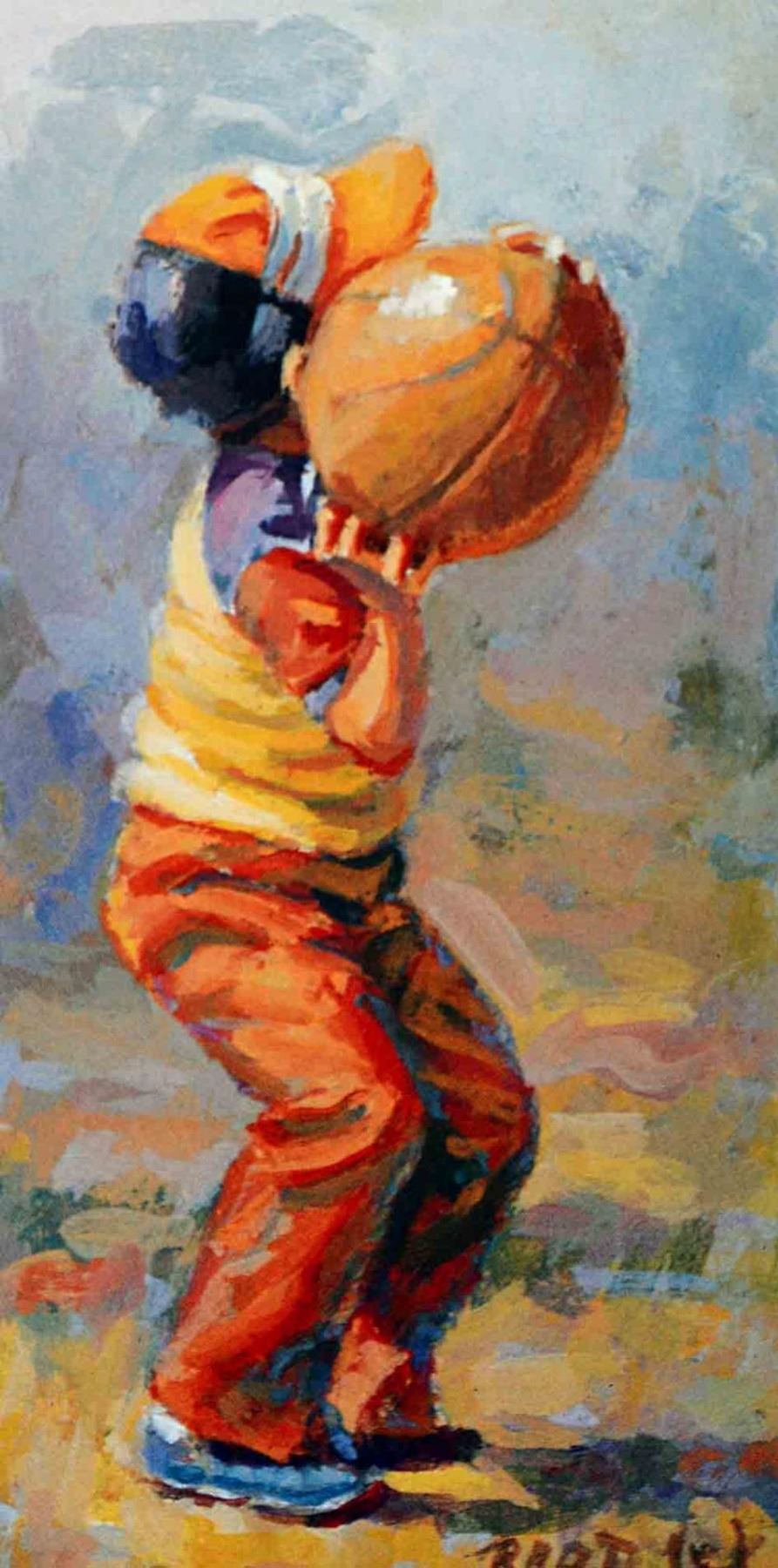 Artist: Lucelle Raad (b. 1942) - Title: Long Shot - Medium: Offset Lithograph on Paper - Signature: Hand-signed by the Artist - Limited Edition: 950 - Image Size: Approximately 6 Inches x 3 inches - Paper Size: Approximately 8 inches x 5 inches - Framed: Unframed - Details: This work comes with a Certificate of Authenticity - Biography: Many are touched by Lucelle's blending of the hopeful innocence of children in a commonplace setting. Each case awakens nostalgia for that youthful honesty and simplicity in all that view her work. The recipient of multiple awards, her most prized award was received at the world famous Washington Square Art Exhibit, an annual event in New York which is an invitational, juried show with over 500 artists from every corner of the globe. Lucelle's art graces many corporate, public, and private collections in every state in the union and in countries around the world.