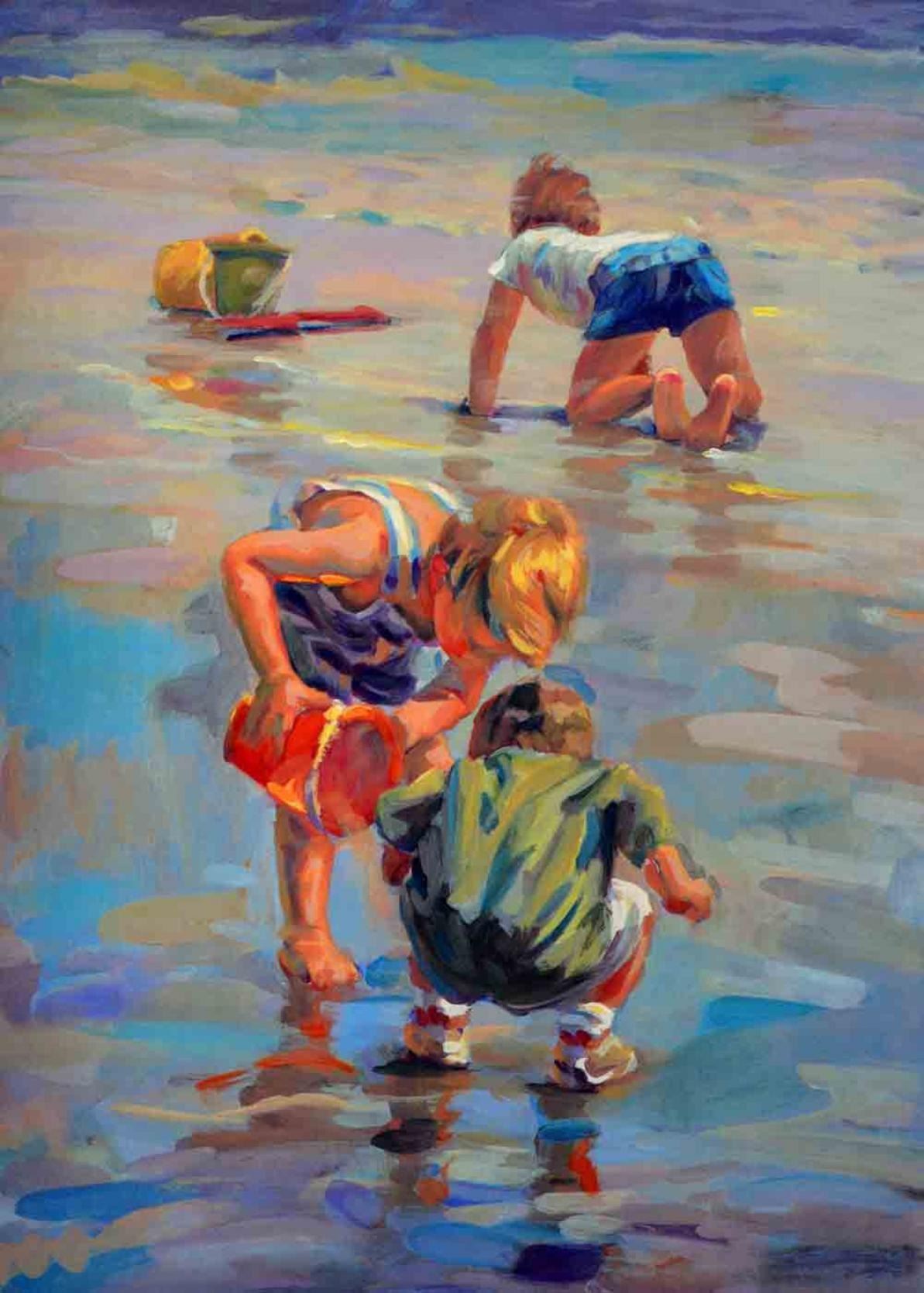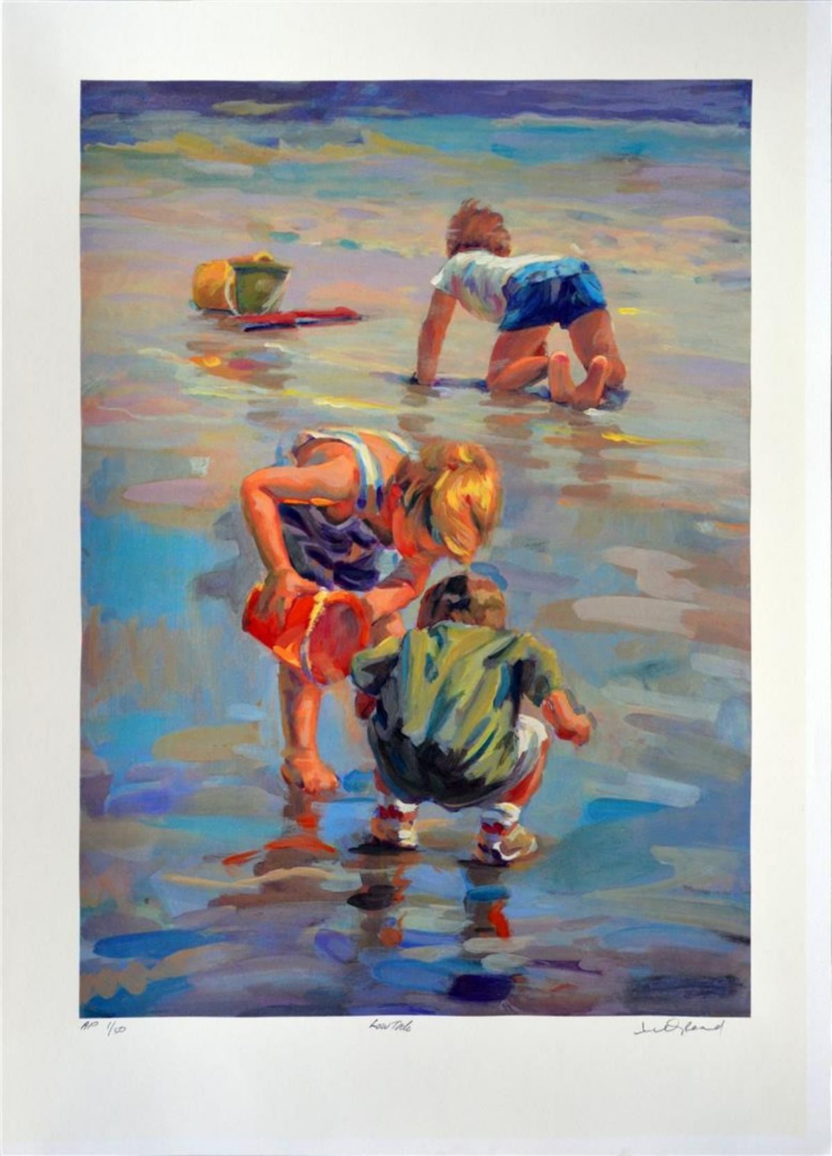Artist: Lucelle Raad (b. 1942) - Title: Low Tide - Medium: Serigraph on Fine Art Paper - Signature: Hand-signed by the Artist - Limited Edition: AP 50 - Image Size: Approximately 21.5 Inches x 15 inches - Paper Size: Approximately 26.25 inches x 18.5 inches - Unframed - Details: This work comes with a Certificate of Authenticity - Biography: Many are touched by Lucelle's blending of the hopeful innocence of children in a commonplace setting. Each case awakens nostalgia for that youthful honesty and simplicity in all that view her work. The recipient of multiple awards, her most prized award was received at the world famous Washington Square Art Exhibit, an annual event in New York which is an invitational, juried show with over 500 artists from every corner of the globe. Lucelle's art graces many corporate, public, and private collections in every state in the union and in countries around the world.