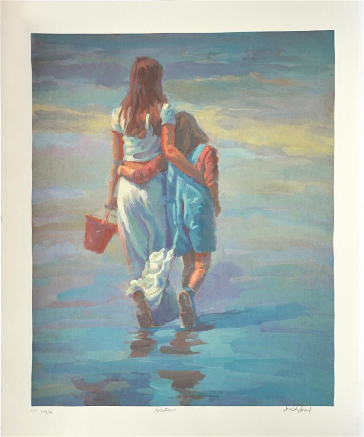 Artist: Lucelle Raad (b. 1942) - Title: Reflections - Medium: Serigraph on Fine Art Paper - Signature: Hand-signed by the Artist - Limited Edition: AP 50 - Image Size: Approximately 22 Inches x 17.5 inches - Paper Size: Approximately 25.75 inches x 21.5 inches - Framed: Unframed - Details: This work comes with a Certificate of Authenticity - Biography: Many are touched by Lucelle's blending of the hopeful innocence of children in a commonplace setting. Each case awakens nostalgia for that youthful honesty and simplicity in all that view her work. The recipient of multiple awards, her most prized award was received at the world famous Washington Square Art Exhibit, an annual event in New York which is an invitational, juried show with over 500 artists from every corner of the globe. Lucelle's art graces many corporate, public, and private collections in every state in the union and in countries around the world.