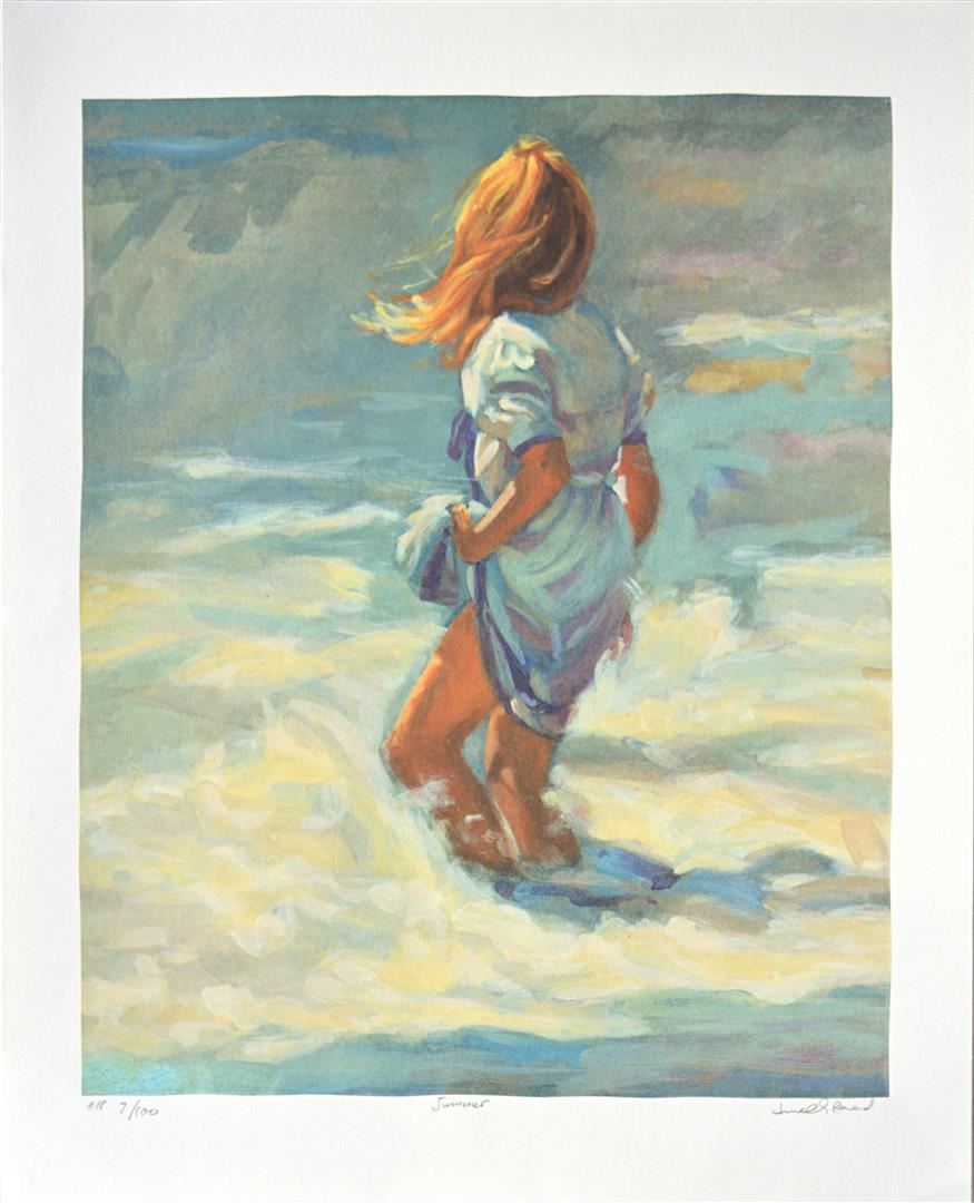 Artist: Lucelle Raad (b. 1942) - Title: Summer - Medium: Serigraph on Fine Art Paper - Signature: Hand-signed by the Artist - Limited Edition: AP 100 - Image Size: Approximately 19.5 Inches x 15.5 inches - Paper Size: Approximately 23.25 inches x 18..75 inches - Framed: Unframed - Details: This work comes with a Certificate of Authenticity - Biography: Many are touched by Lucelle's blending of the hopeful innocence of children in a commonplace setting. Each case awakens nostalgia for that youthful honesty and simplicity in all that view her work. The recipient of multiple awards, her most prized award was received at the world famous Washington Square Art Exhibit, an annual event in New York which is an invitational, juried show with over 500 artists from every corner of the globe. Lucelle's art graces many corporate, public, and private collections in every state in the union and in countries around the world.