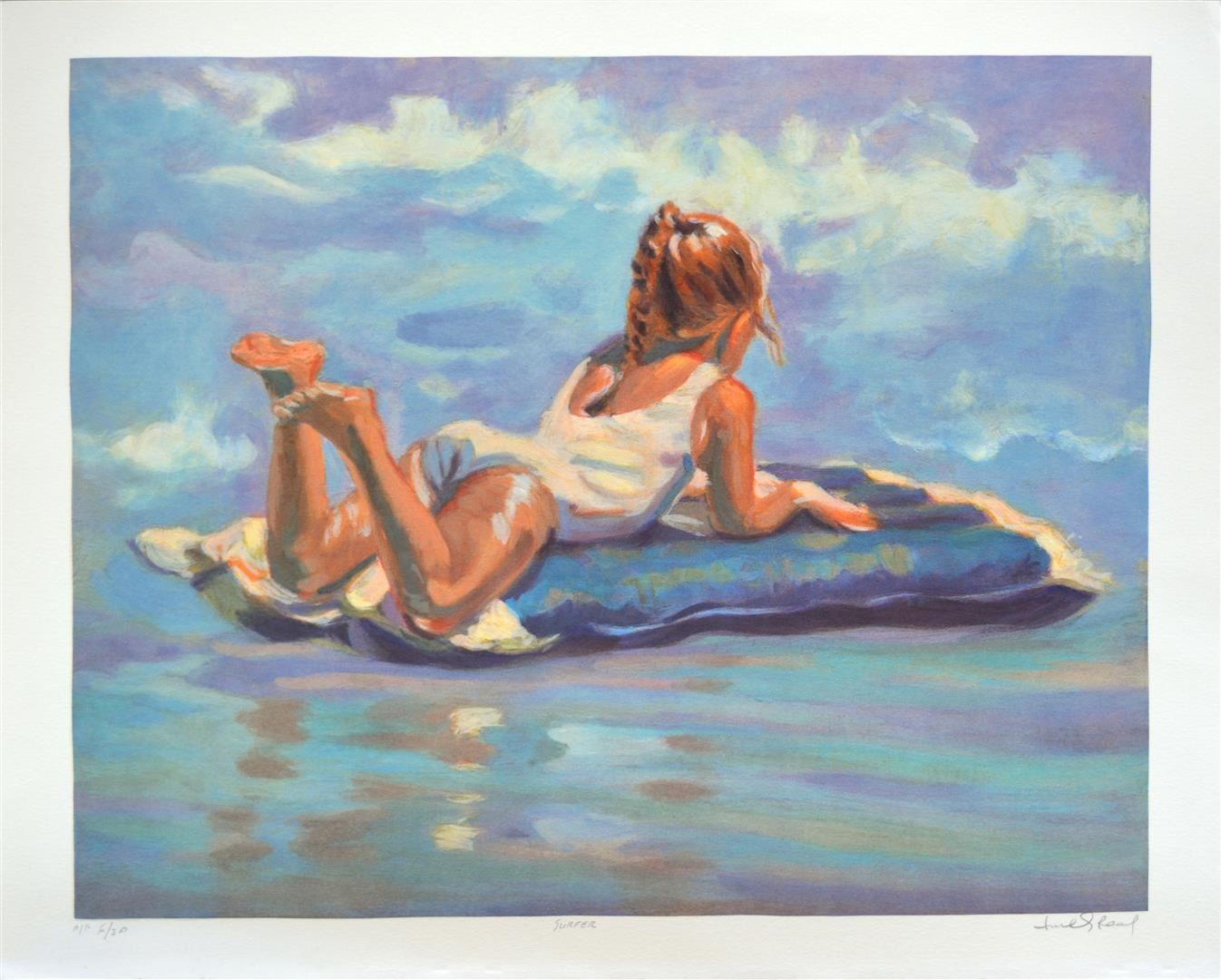 Artist: Lucelle Raad (b. 1942) - Title: Surfer - Medium: Serigraph on Fine Art Paper - Signature: Hand-signed by the Artist - Limited Edition: AP 30 - Image Size: Approximately 15 Inches x 18.75 inches - Paper Size: Approximately 17 inches x 21.5 inches - Unframed - Details: This work comes with a Certificate of Authenticity - Biography: Many are touched by Lucelle's blending of the hopeful innocence of children in a commonplace setting. Each case awakens nostalgia for that youthful honesty and simplicity in all that view her work. The recipient of multiple awards, her most prized award was received at the world famous Washington Square Art Exhibit, an annual event in New York which is an invitational, juried show with over 500 artists from every corner of the globe. Lucelle's art graces many corporate, public, and private collections in every state in the union and in countries around the world.