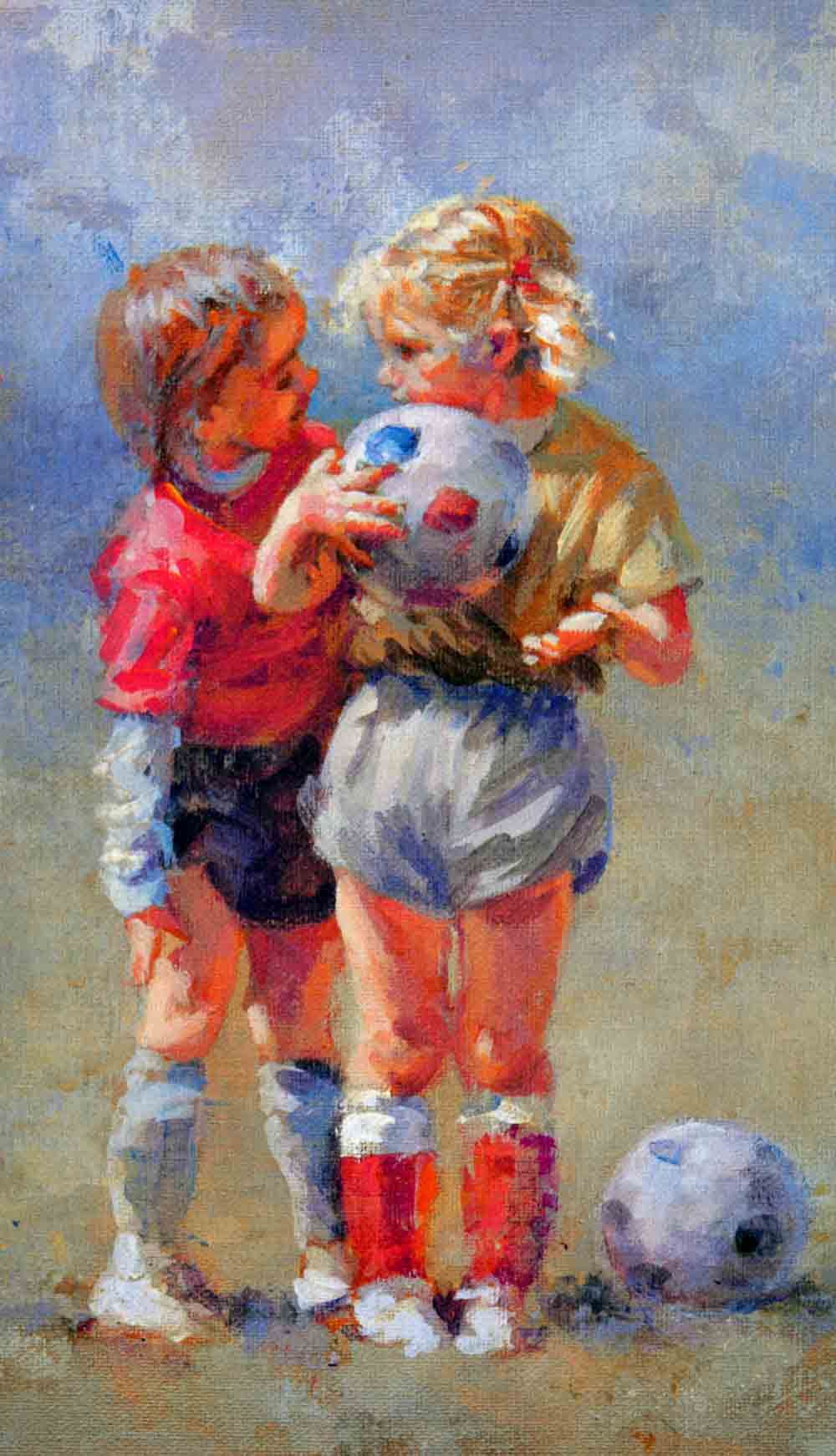 Artist: Lucelle Raad (b. 1942) - Title: Sweet Talk - Medium: Offset Lithograph on Paper - Signature: Hand-signed by the Artist - Image Size: Approximately 12 Inches x 7 inches - Paper Size: Approximately 14 inches x 9 inches - Framed: Unframed - Details: This work comes with a Certificate of Authenticity - Biography: Many are touched by Lucelle's blending of the hopeful innocence of children in a commonplace setting. Each case awakens nostalgia for that youthful honesty and simplicity in all that view her work. The recipient of multiple awards, her most prized award was received at the world famous Washington Square Art Exhibit, an annual event in New York which is an invitational, juried show with over 500 artists from every corner of the globe. Lucelle's art graces many corporate, public, and private collections in every state in the union and in countries around the world.