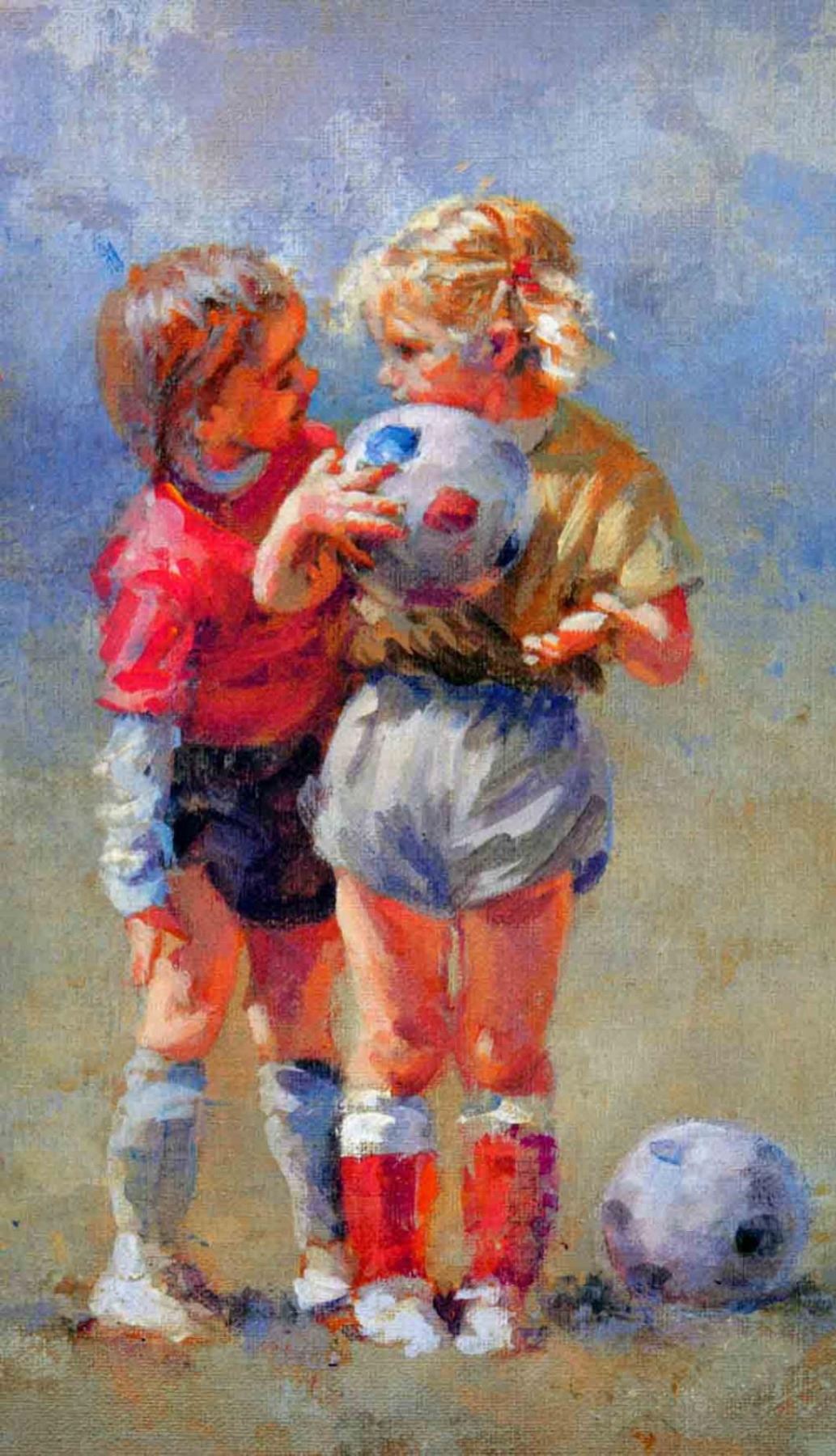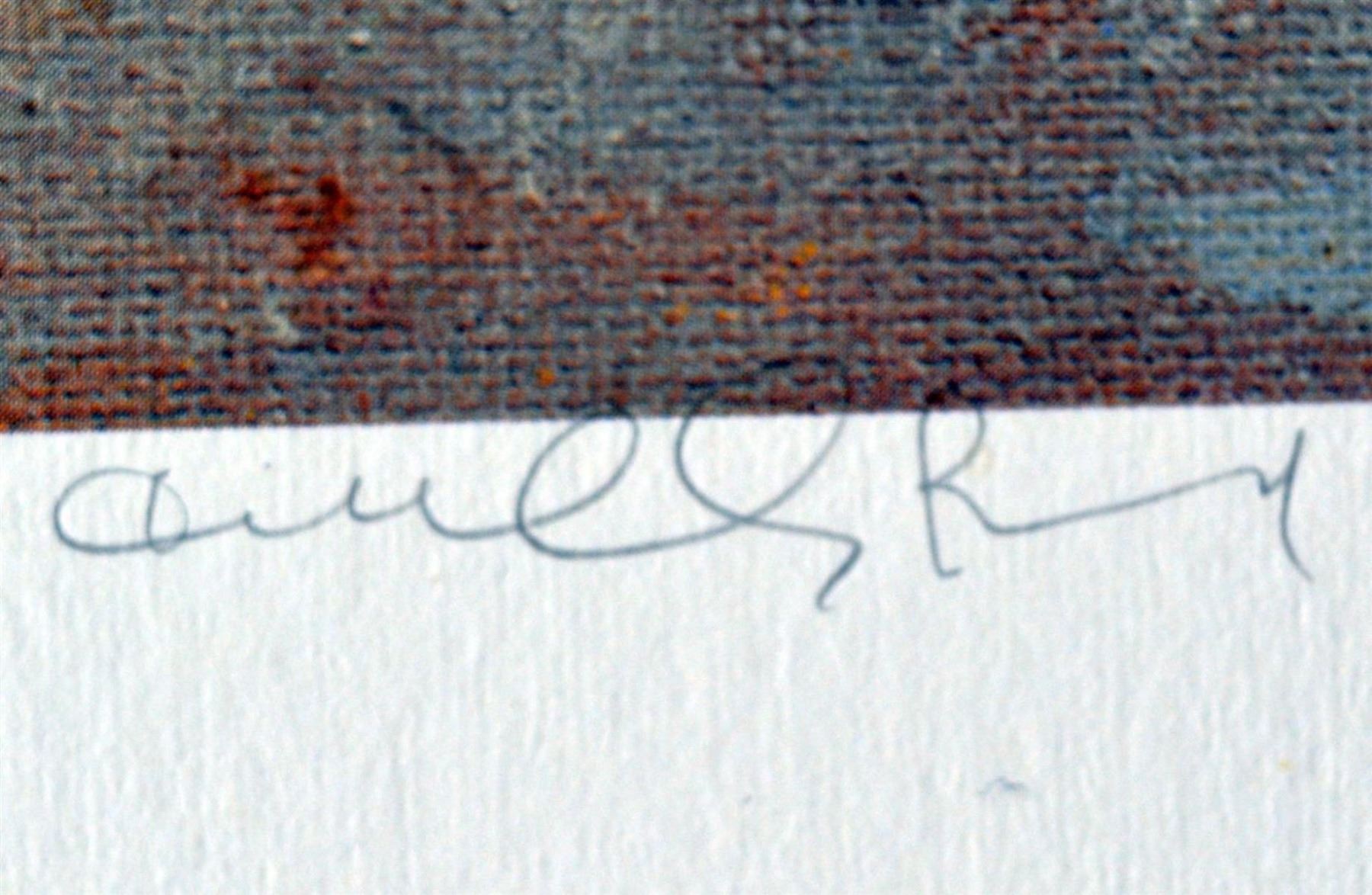 Artist: Lucelle Raad (b. 1942) - Title: Sweet Talk - Medium: Offset Lithograph on Paper - Signature: Hand-signed by the Artist - Image Size: Approximately 12 Inches x 7 inches - Paper Size: Approximately 14 inches x 9 inches - Framed: Unframed - Details: This work comes with a Certificate of Authenticity - Biography: Many are touched by Lucelle's blending of the hopeful innocence of children in a commonplace setting. Each case awakens nostalgia for that youthful honesty and simplicity in all that view her work. The recipient of multiple awards, her most prized award was received at the world famous Washington Square Art Exhibit, an annual event in New York which is an invitational, juried show with over 500 artists from every corner of the globe. Lucelle's art graces many corporate, public, and private collections in every state in the union and in countries around the world.