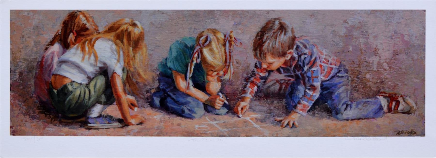 Artist: Lucelle Raad (b. 1942) - Title: Tic Tac Toe - Medium: Offset Lithograph on Paper - Signature: Hand-signed by the Artist - Limited Edition: 950 - Image Size: Approximately 6 Inches x 20 inches - Paper Size: Approximately 7.5 inches x 21 inches - Unframed - Details: This work comes with a Certificate of Authenticity - Biography: Many are touched by Lucelle's blending of the hopeful innocence of children in a commonplace setting. Each case awakens nostalgia for that youthful honesty and simplicity in all that view her work. The recipient of multiple awards, her most prized award was received at the world famous Washington Square Art Exhibit, an annual event in New York which is an invitational, juried show with over 500 artists from every corner of the globe. Lucelle's art graces many corporate, public, and private collections in every state in the union and in countries around the world.