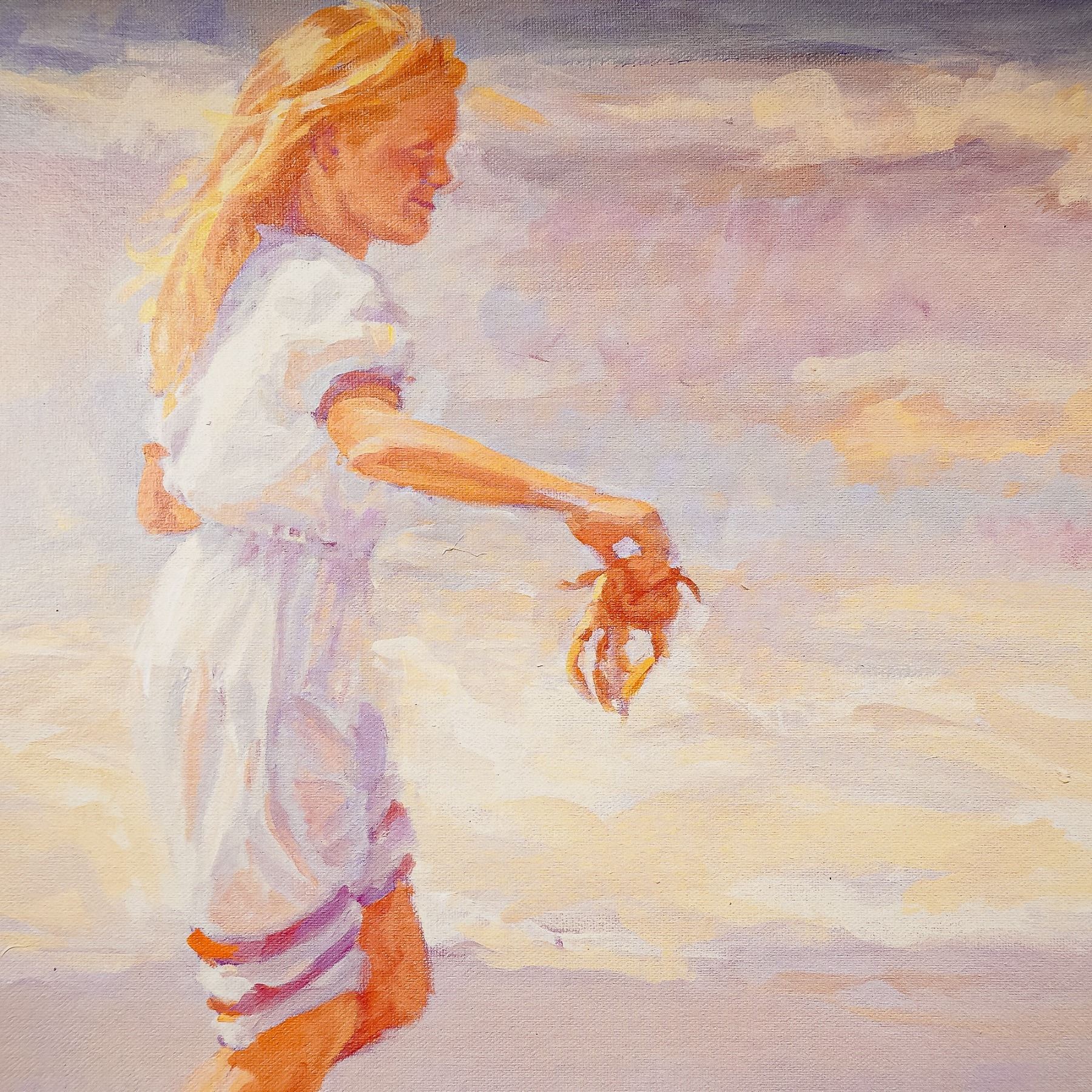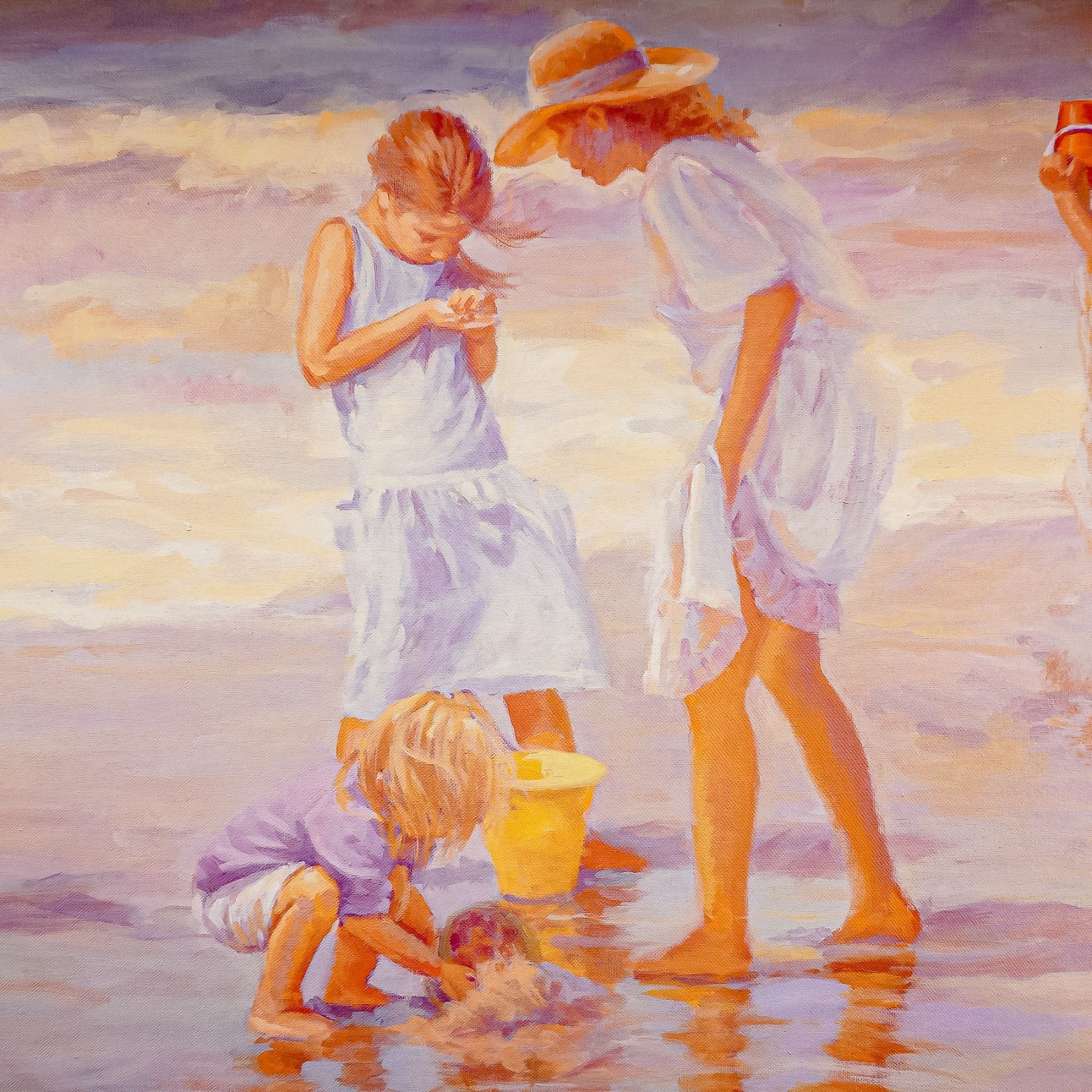 Capturing the warmth of childhood innocence at the seaside, this poster print by British-American artist Lucelle Raad depicts a vibrant beach scene filled with children at play. Rendered in soft pastel tones of lavender, peach, and gold, the composition shows young figures exploring sand and surf, their movements illuminated by light that glows across the water and sky. Raad is celebrated for her nostalgic portrayals of children in moments of discovery, often evoking the carefree joy of summer days. This work reflects the artist's characteristic blend of impressionistic brushwork with gentle, storytelling charm. Signed in plate lower right.