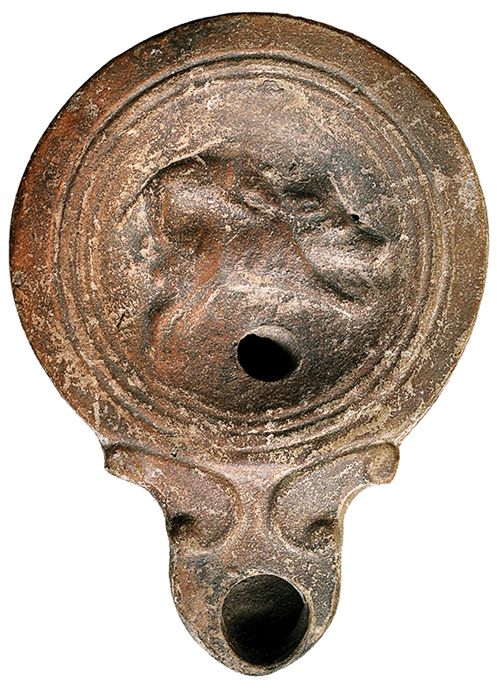 Lucerna. Decorada con lebrel cazando un jabalí. Siglos II-I a.C. Terracota. Longitud 10,2 cm.