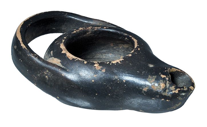 Lucerna. Siglo IV a.C. Cerámica. Longitud 9,0 cm. Colección privada de Suiza, años 1970's.