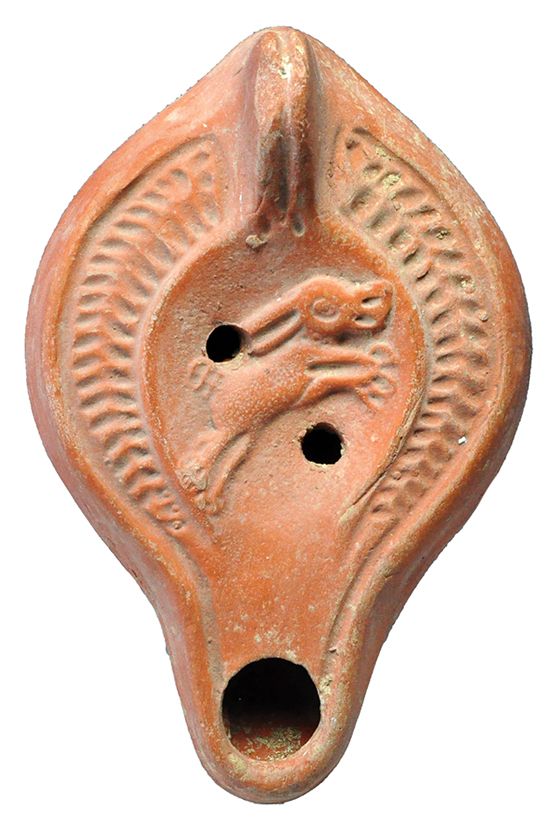 Lucerna (siglos IV-V d.C.). Decorada con liebre. Roma-Bizancio. Terracota. Longitud 13,0 cm. Marca de alfarero en forma de palma.