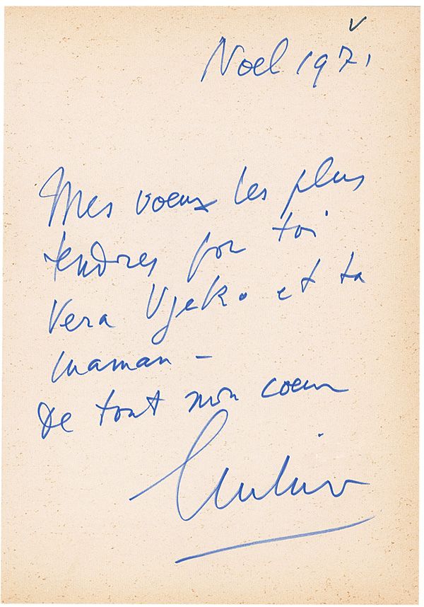 Acclaimed director of Ossessione, Death in Venice, and The Damned. Christmas card, signed “Luchino,” measuring 6 x 8.5, featuring an image of King Ludwig II on the cover, dated by Visconti “Noel 1971.” On the inside, Visconti writes a brief message, in French, signed at the conclusion. In fine condition, with some mild toning and foxing working in from the edges.