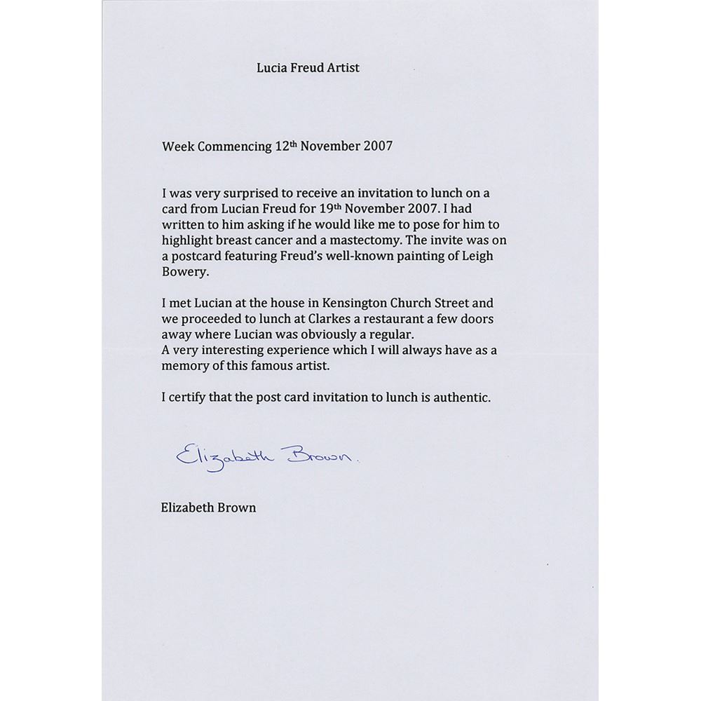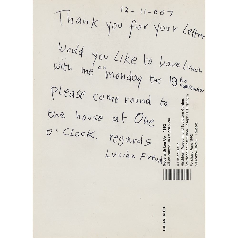 Important German-born British artist (1922–2011) best known for his distinctive, often enigmatic portraits ALS, one page on a 4 x 5.75 postcard of his 'Nude with Leg Up (1992),' November 12, 2007. Handwritten letter to Elizabeth Brown, in part: "Thank you for your letter. Would you like to have lunch with me on Monday the 19th November. Please come round to the house at one o'clock." In very fine condition. Accompanied by the original mailing envelope, addressed in his own hand, and a letter of provenance from the recipient, in full: I was very surprised to receive an invitation to lunch on a card from Lucian Freud for 19th November 2007. I had written to him asking if he would like me to pose for him to highlight breast cancer and a mastectomy. The invite was on a postcard featuring Freud's well-known painting of Leigh Bowery. I met Lucian at the house in Kensington Church Street and we proceeded to lunch at Clarkes a restaurant a few doors away where Lucian was obviously a regular."