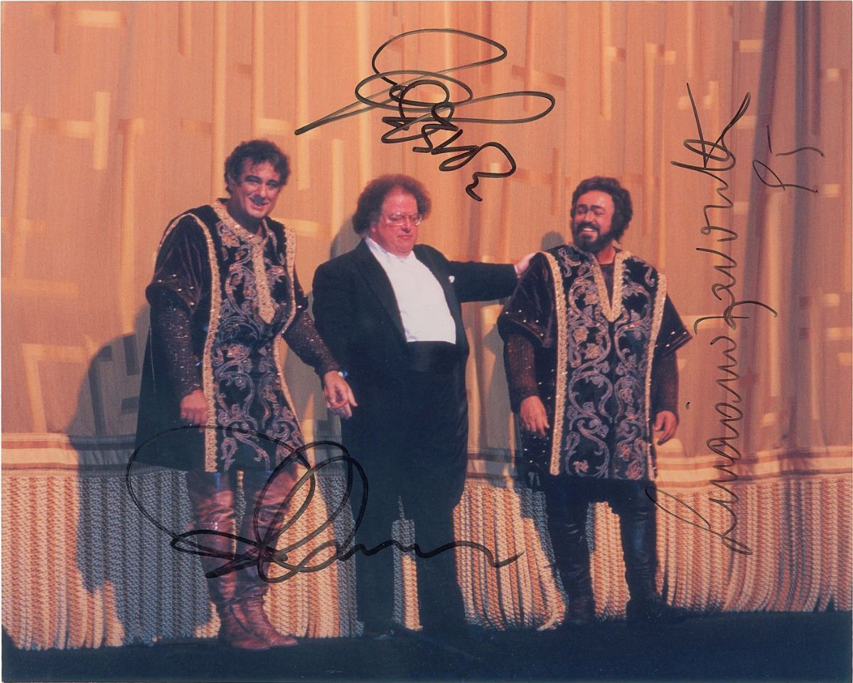 Color glossy 10 x 8 photo of Luciano Pavarotti and Placido Domingo on stage with longtime Met conductor James Levine, each signing in black felt tip. In fine condition.