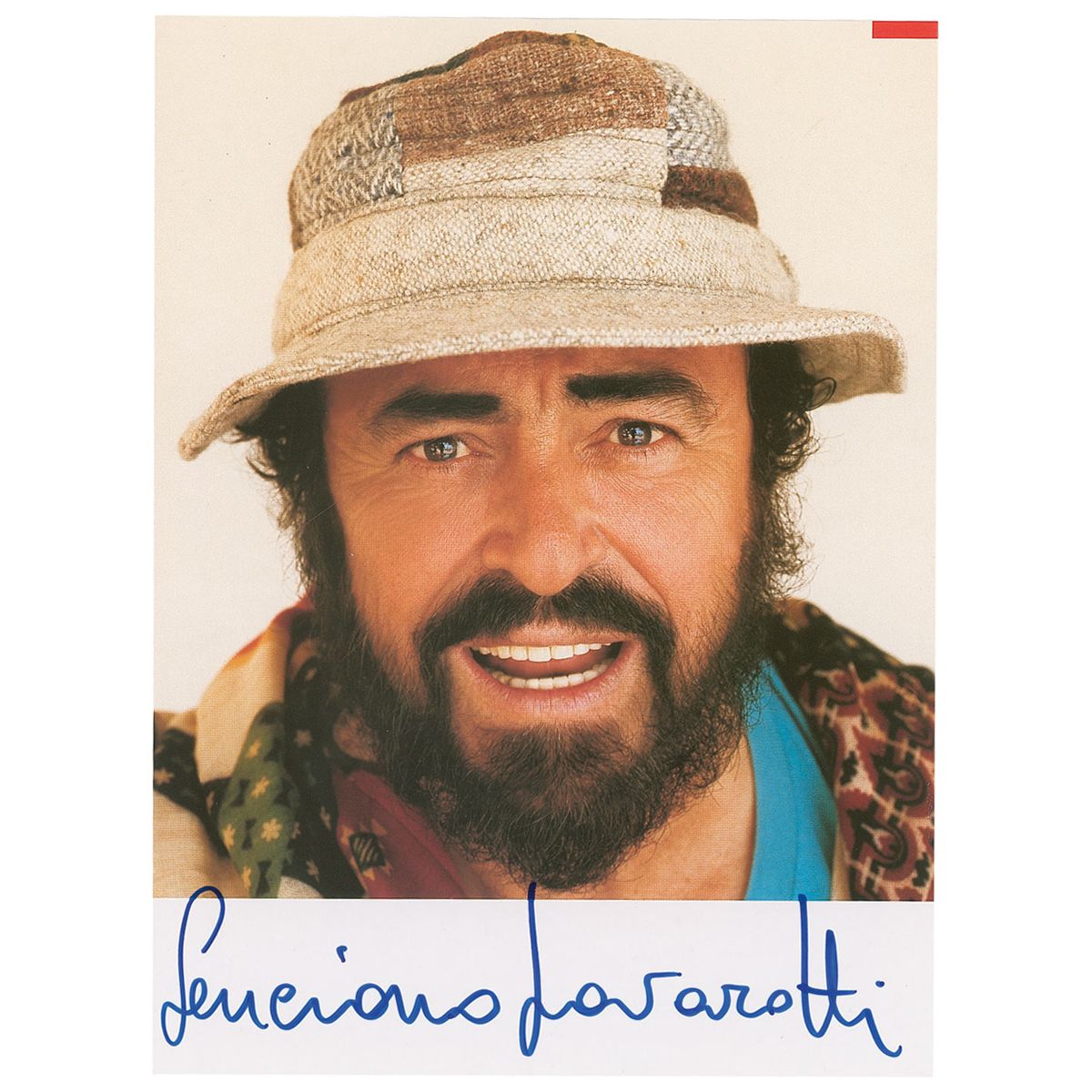 Color 8.5 x 11 cardstock close-up photo of Pavarotti in a sun hat, signed in the bottom border in blue felt tip. In very fine condition.