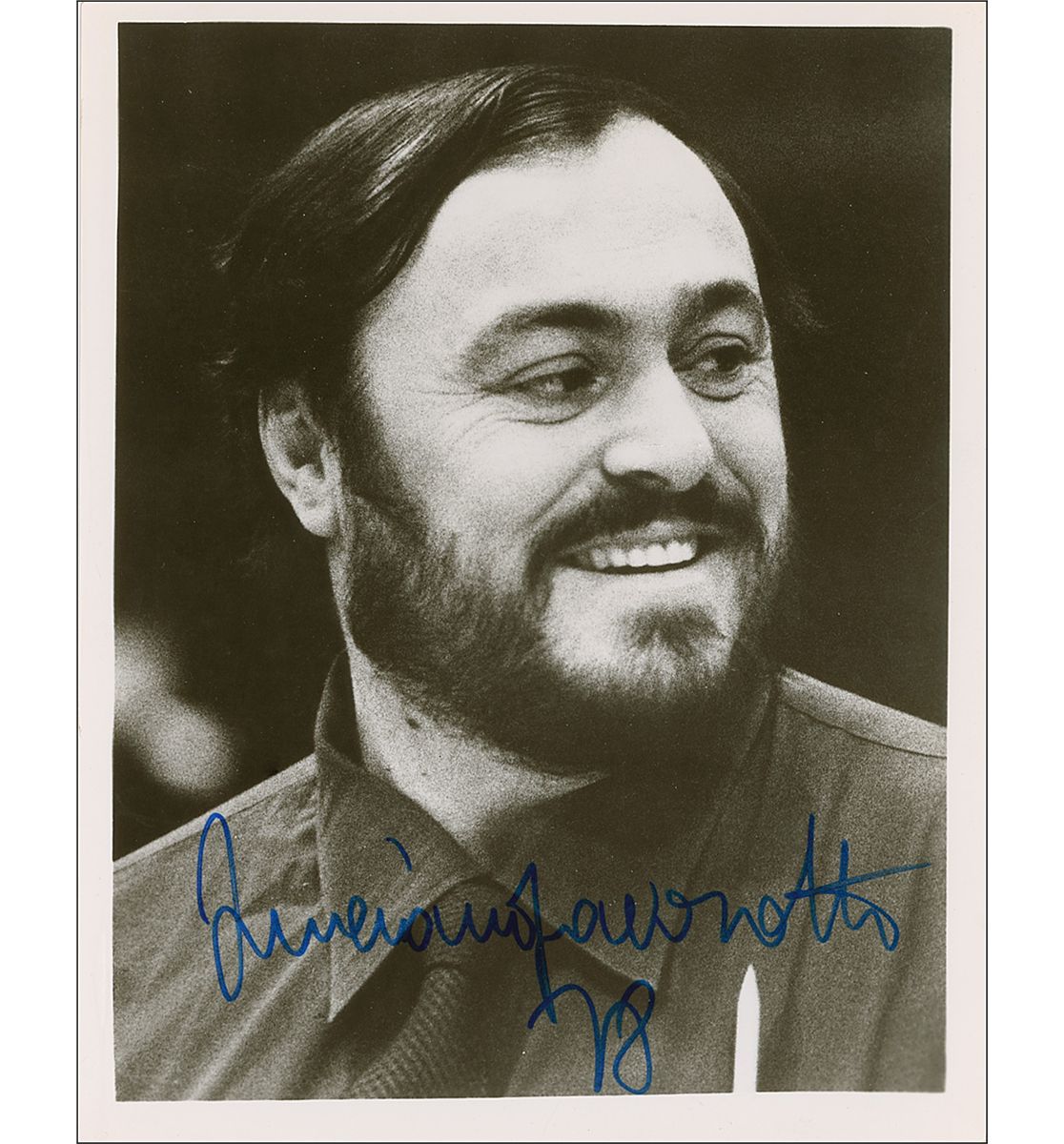 Glossy 8 x 10 photo of a smiling Pavarotti in a shirt and tie, signed in blue felt tip “Luciano Pavarotti ‘78.” In fine condition, with upper right corner creases and a few bends.