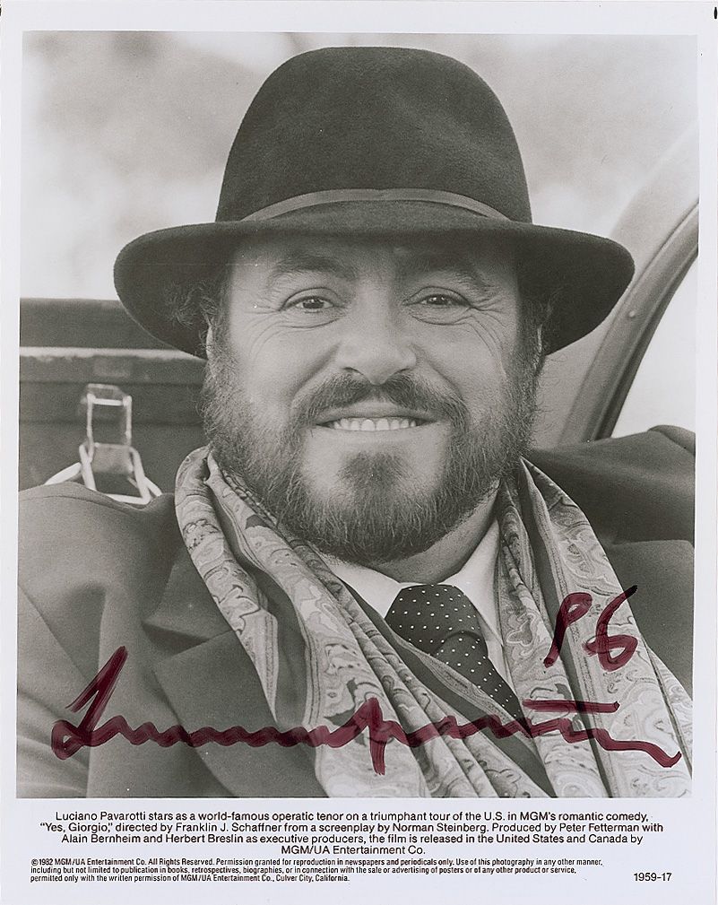 Glossy 8 x 10 promotional photo of Pavarotti for MGM’s Yes, Giorgio, signed in black felt tip, “Luciano Pavarotti 86.” In fine condition.