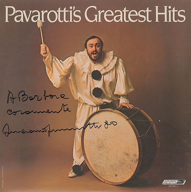Pavarotti’s Greatest Hits album signed and inscribed on the front cover in black felt tip and dated 1980. In fine condition. The record is included.