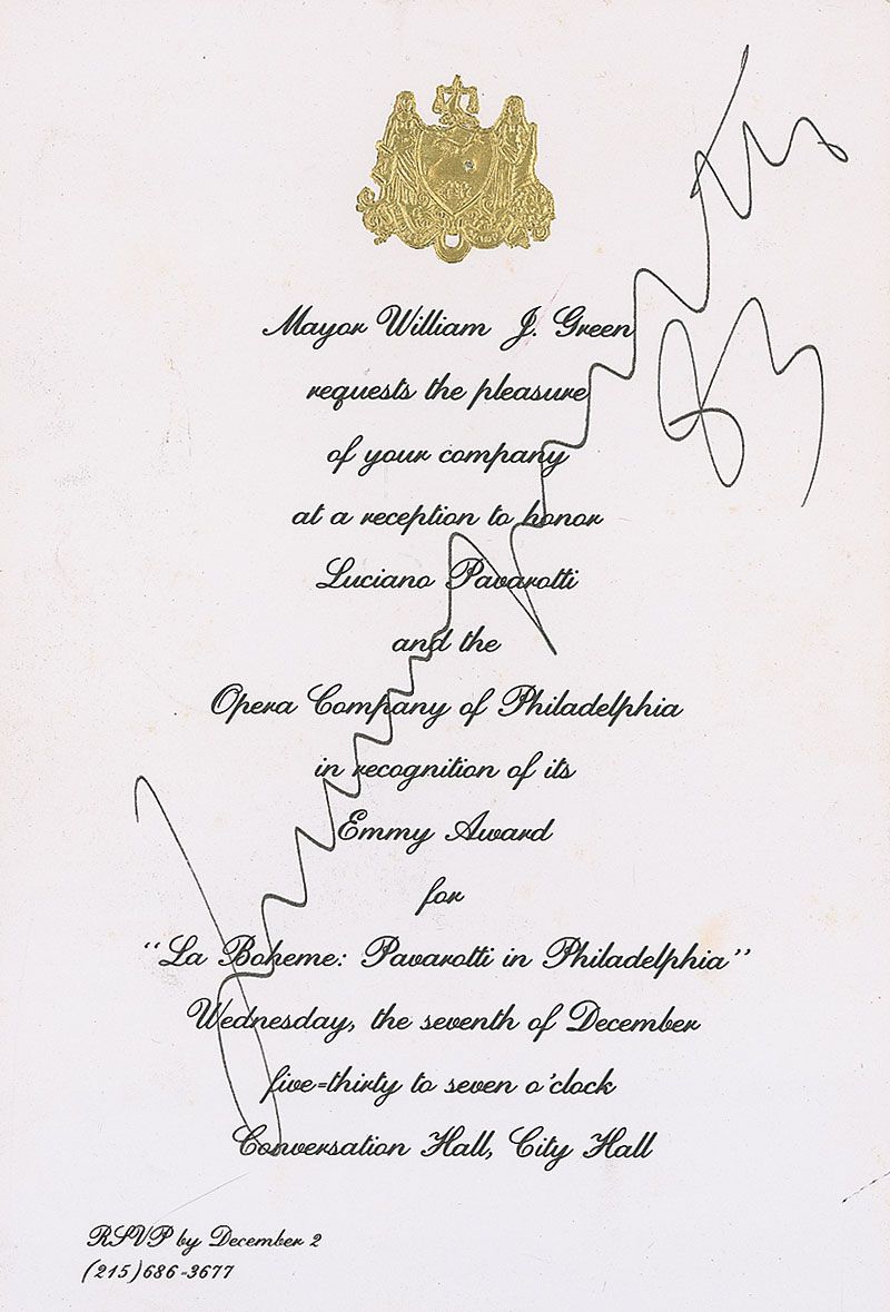 Printed invitation, 5.25 x 7.75, for a reception in Philadelphia in recognition of Pavarotti’s Emmy award for ‘La Boheme: Pavarotti in Philadelphia,’ signed in black ink, “Luciano Pavarotti 83.” Invitation is affixed to an 8 x 10 off-white sheet. In fine condition, with a couple trivial spots of toning.