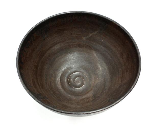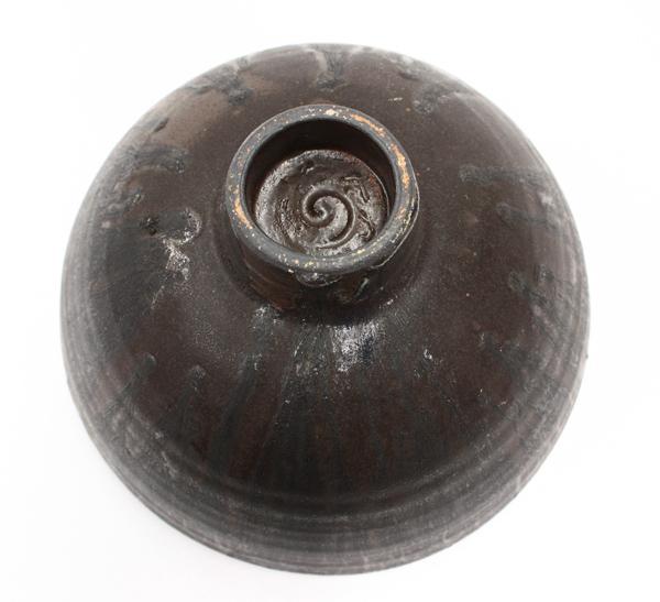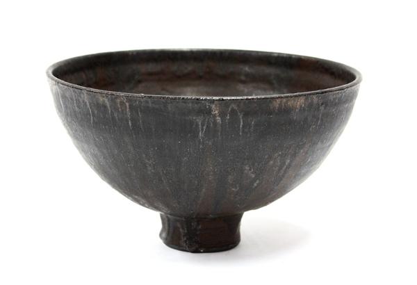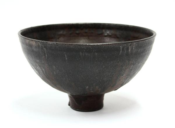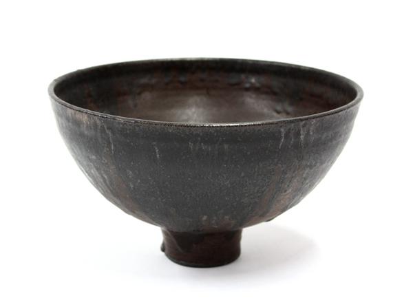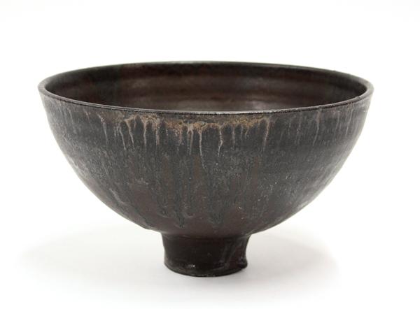 Lucie Rie (1902-1995), Earthenware footed vessel circa 1950, the tapering form having a mocha brown glaze accented with an anthracite drip glaze to the exterior and terminating on a footed base, signed on the underside with Lucie Rie Cipher, ''LR'', 5.5''h x 9.5''w