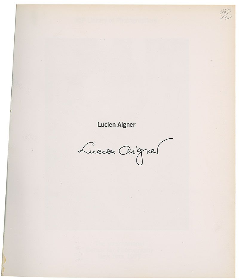 Signed book: Lucien Aigner. NY: International Center for Photography, 1979. Hardcover, 7.5 x 9, 127 pages. Signed on the half-title page in black ink. In fine condition, with diagonal bends to opening pages, none affecting the signature.
