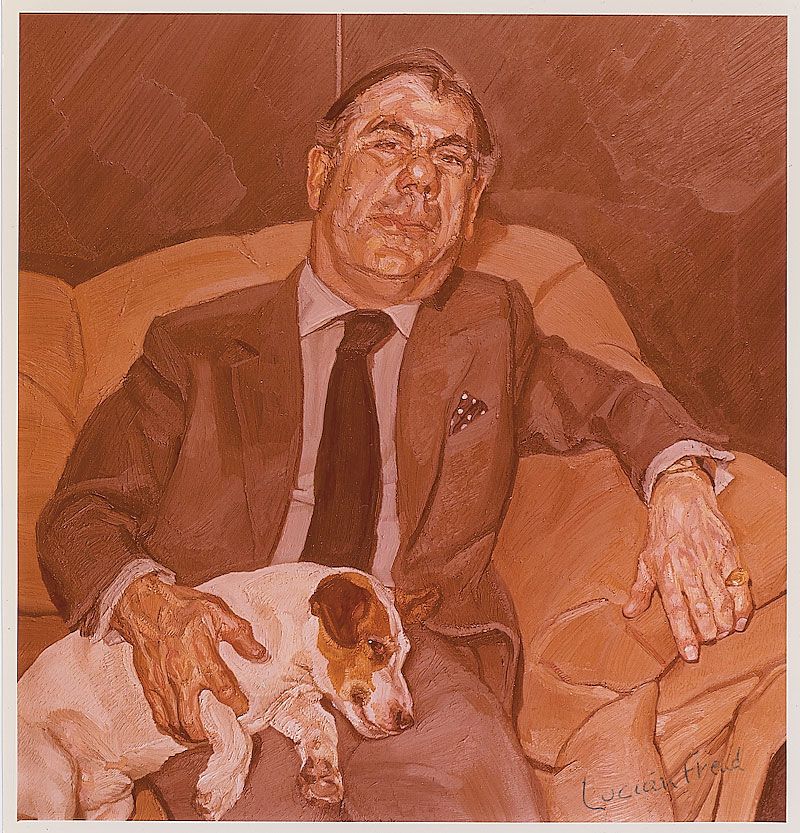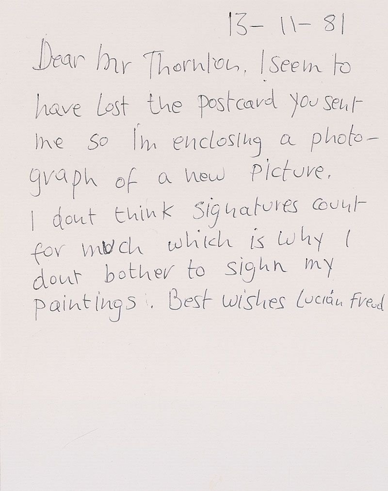 Preeminent painter (1922–2011) known for his for his psychologically intense, thickly impastoed portrait and figure paintings. Two items: color satin-finish 8 x 8 photo of Freud’s painting entitled ‘Guy and Speck,’ signed in the lower right in black ballpoint; and an ALS responding to the initial autograph request, one page, 7 x 9, November 11, 1981. In party: “I’m enclosing a photograph of a new picture. I don’t think signatures count for much which is why I don’t bother to sighn [sic] my paintings.” In overall fine condition.