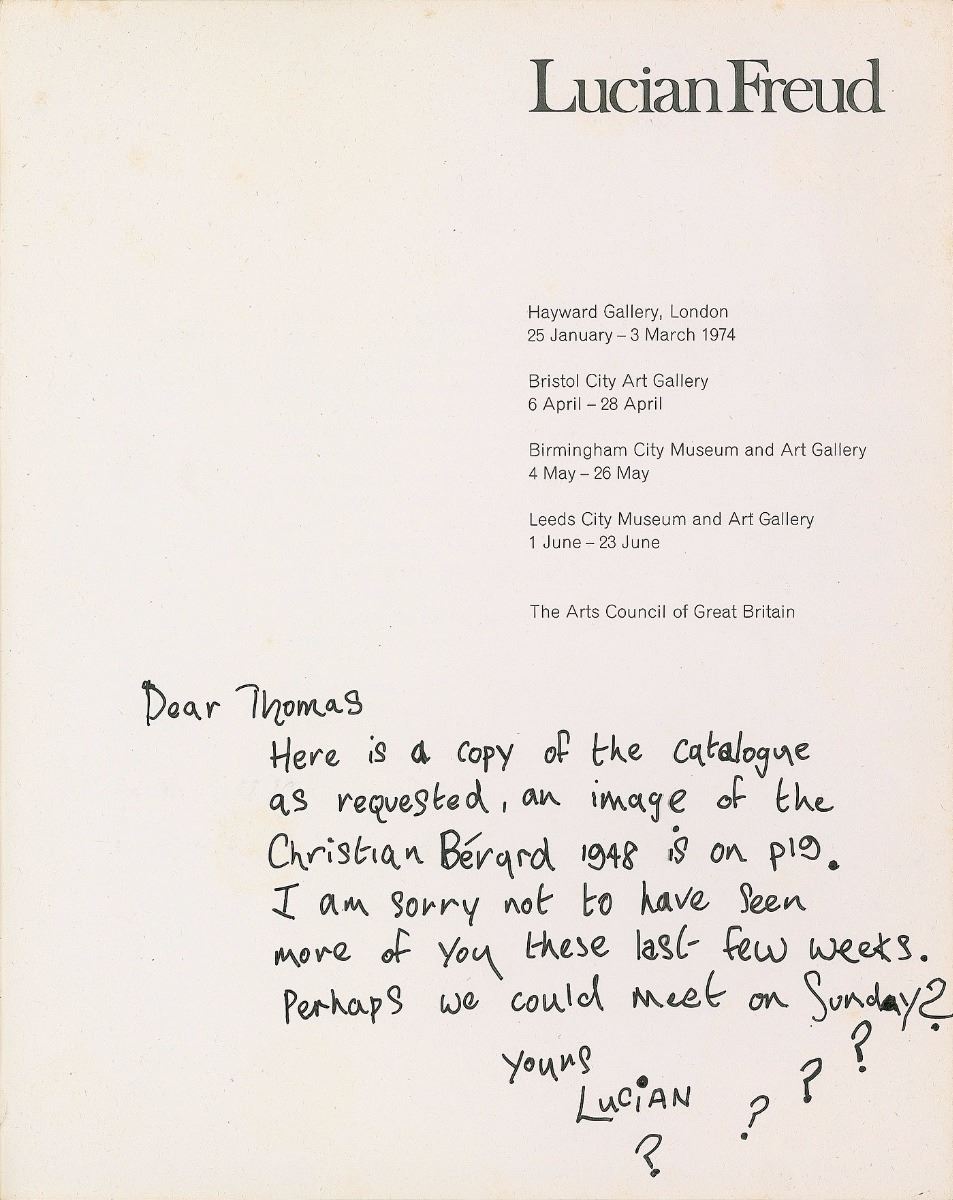 British painter (1922–2011) known for his psychologically intense, thickly impastoed portrait and figure paintings. Scarce softcover catalog celebrating the 1974 retrospective exhibition of Lucian Freud, published by De lange/Van Leer Deventer of the Netherlands, 8.25 x 10, 55 pages, signed and inscribed on an opening page in black ink, “Dear Thomas, Here is a copy of the catalogue as requested, an image of the Christian Berard 1948 is on p19. I am sorry not to have seen more of you these last few weeks. Perhaps we could meet on Sunday? Yours, Lucian.” In fine condition. In 1974, the Arts Council of Great Britain organized the first retrospective exhibition for the many paintings and drawings of Lucian Freud. With contributions from both public and private lenders, the substantial showcase debuted at London’s Hayward Gallery in late January. A wonderful piece of artistic literature honoring his many influential works.