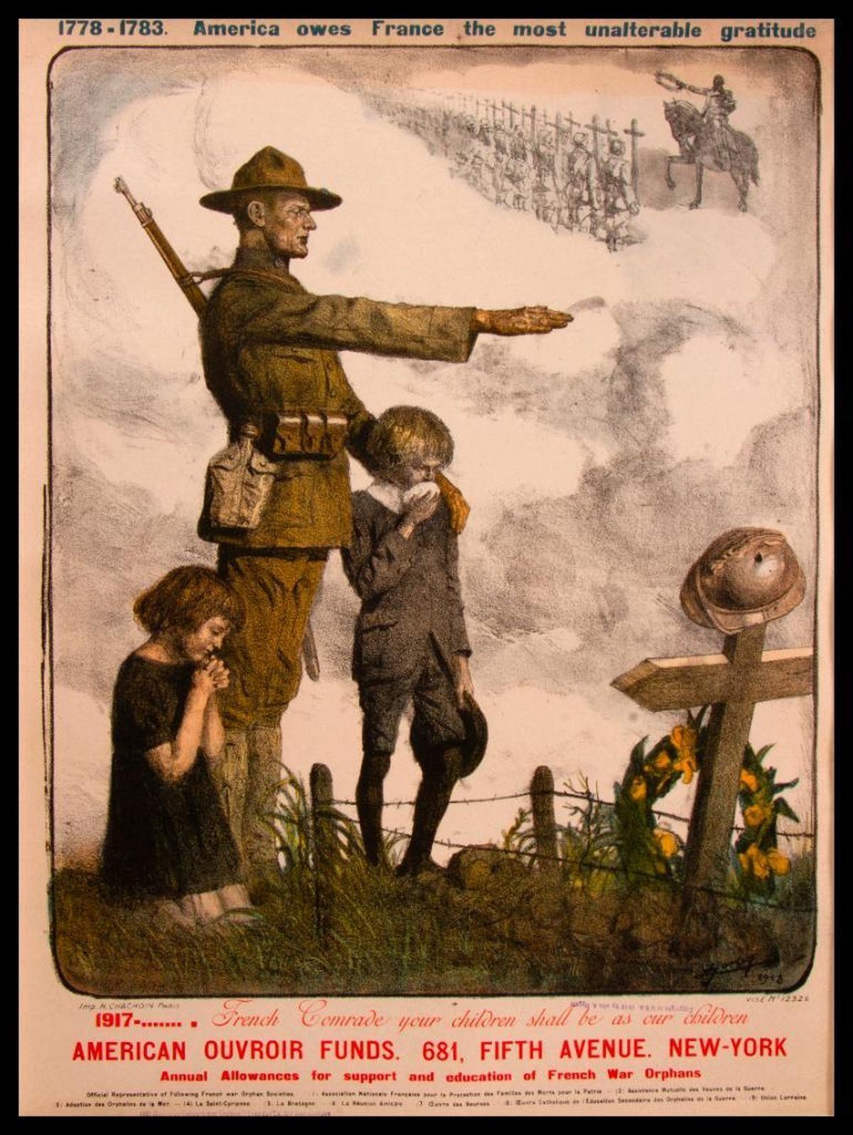 Vintage World War I Poster. 1778-1783--America Owes France, 1918 [French size]. Paper size: 33 3/8 x 25 3/4 inches. Linen backed. Condition: as per photograph.