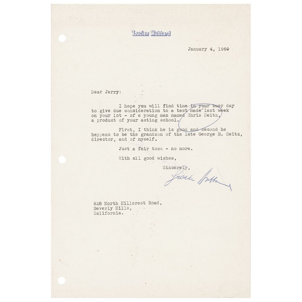 TLS, one page, 7.25 x 10.25, personal letterhead, January 4, 1960. Hubbard writes, in full: “I hope you will find time in your busy day to give due consideration to a test made last week on your lot—of a young man named Chris Seitz, a product of your acting school. First, I think he is good and second he happens to be the grandson of the late George B. Seitz, director, and of myself. Just a fair toss—no more.” Mild corner creasing, some light toning and surface marks, an ink notation, and three binder holes along the left edge, otherwise fine condition. After winning the award for producing the 1927 Clara Bow film Wings, Hubbard went on to become president of Universal Pictures. This letter, regarding a casting call for his grandson, Chris Seitz (who would go on to star in the 80s series Thirty-Something and Fame), presents Hubbard in a most uncommon format. Accompanied by two unsigned photos.