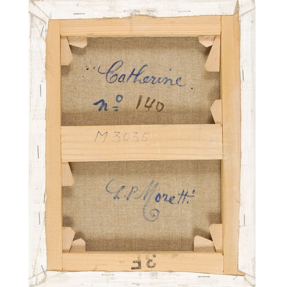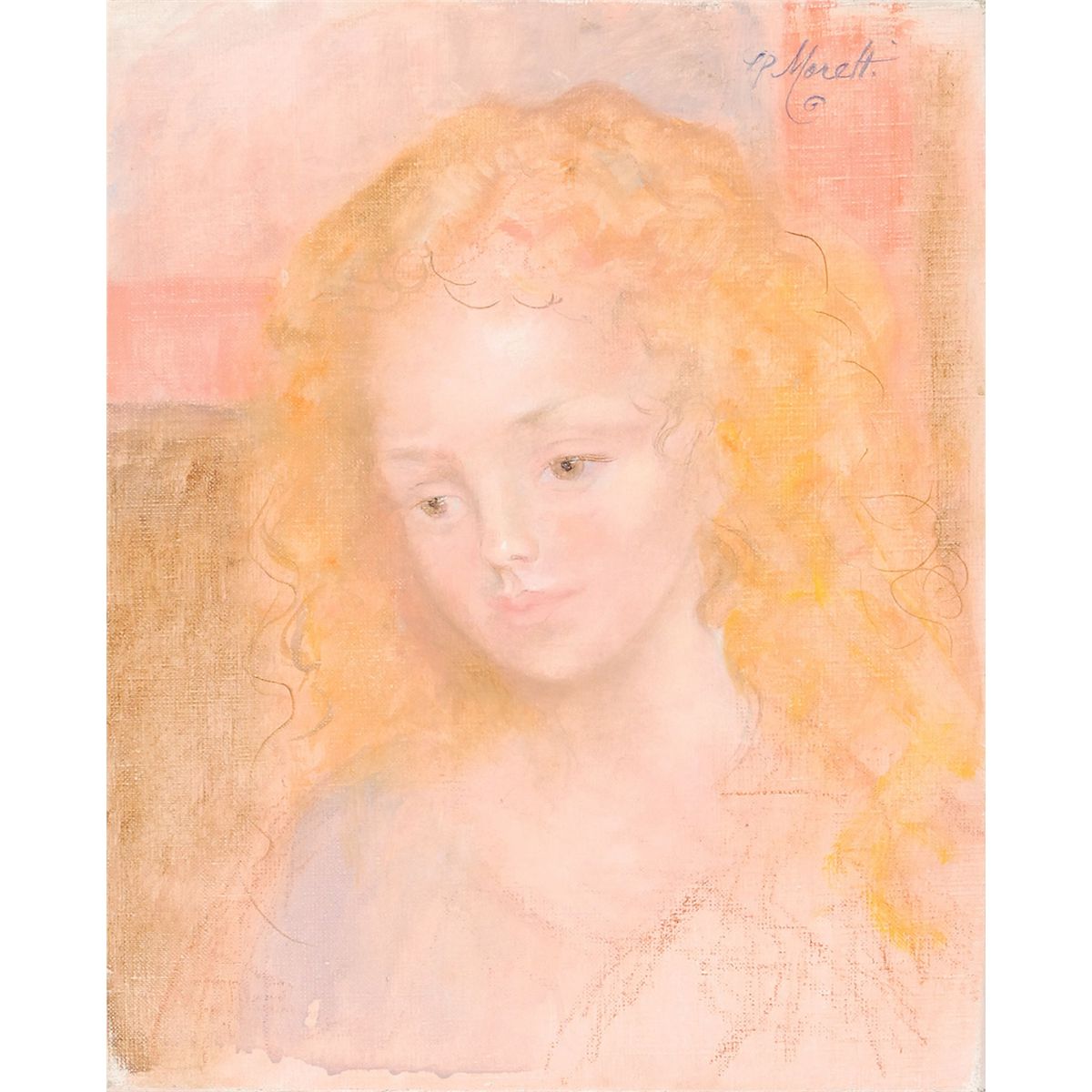 Original painting, entitled “Catherine No. 140,” oil on canvas stretched across a wooden frame, 8.5 x 10.75, depicting a young red-headed woman looking down. Signed in the upper right corner in fountain pen, “L. P. Moretti,” and also signed and titled on the reverse by Moretti. In fine condition. Born in Sureneas, France, in 1922, Lucien Moretti received his formal art training at the Beaux Arts School and went on to achieve great success with his works. From emotional depictions of the Holocaust to carefree portraits of children at play, his work masterfully captures the complexities of human expression. A superb portrait from this celebrated artist, the first we have offered.