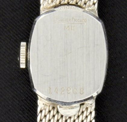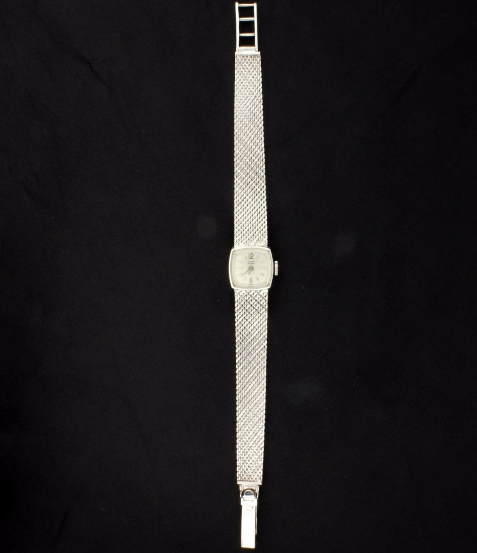 In 14K white gold, the watch and band are both 14K gold. In great condition with a wind movement, runs perfectly. It is 6 3/4 inches long. 23.6g