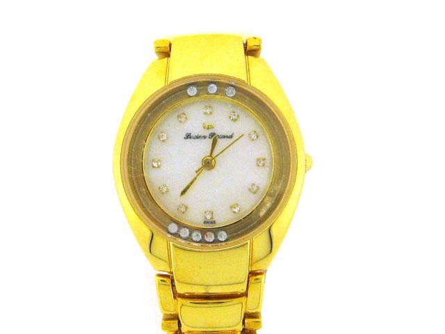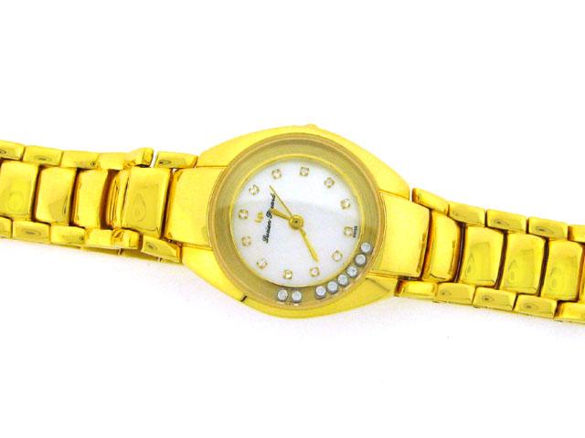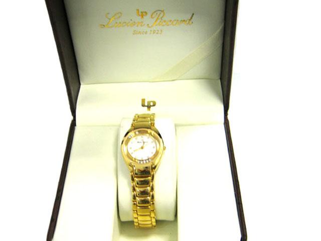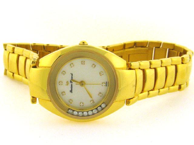 This is a Lucien Piccard 26371MP Ladies watch with the following features: gold tone; stainless steel; white mother of pearl dial; Swarovski crystal markers, sapphire crystal and floating Swarovski crystal in bezel (8 pcs with 1 mm in size); stainless steel bracelet strap with butterfly clasp; Stainless steel case back measuring 10mm; water resistant to 5ATM; and Swiss movement.