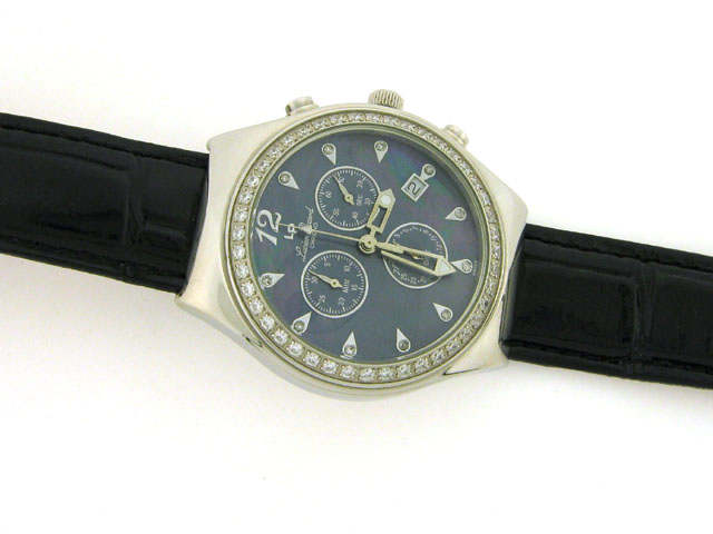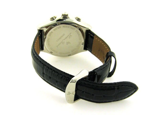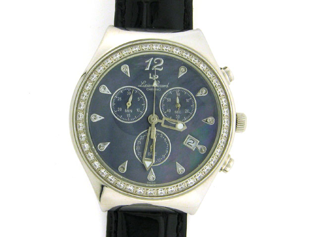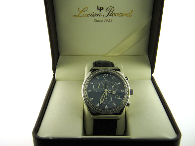 This is a Lucien Piccard 26384WHCZ watch with the following features: stainless steel, round oversized bezel with diamonds; leather strap; Bezel has 44 sparkling diamonds that measure 1.8 mm each with total diamond weight is 1 1/10* carats; Chronograph; Date display at 4 o'clock; Silver hands and second sweep; Sapphire coated crystal; Swiss movement; 3 ATM water resistance; Case dimensions: 39 mm wide; and Strap dimensions: 20 mm wide x 8 inches long