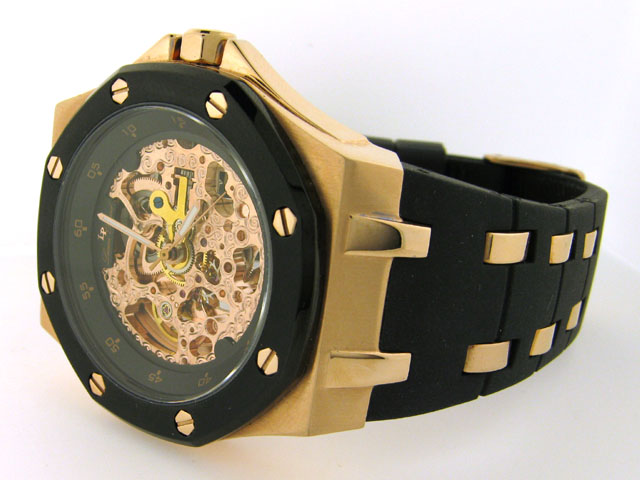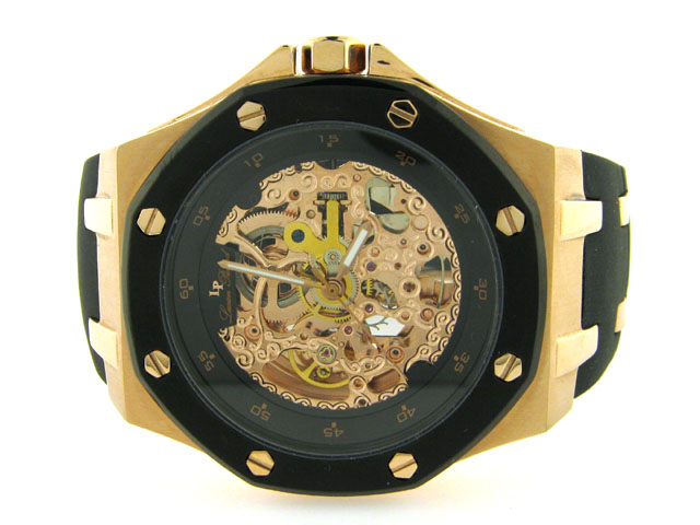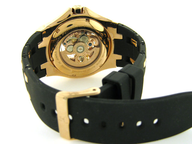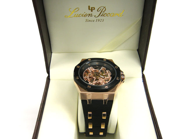 This is a Lucien Piccard Men's 'The Trans' Watch in Stainless Steel with 18K Rose Gold and Rubber Strap (28586ROBK) with the following features: Stainless Steel; 18k rose gold ion plating; Black color; Polished finish; Analog display; Black rubber band w