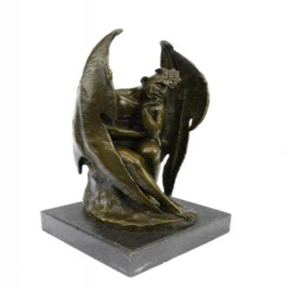 He wraps himself in his wings and holds onto a crucifix while sitting and thinking about his presence in the world. This gargoyle devil has the body of a man but the fingers and toes of a gargoyle. He has horns that grow out of his head with a Mohawk growing down the middle and his facial features are very demonic, like the devil. His wings are not like an angels but the opposite they are similar to a bats wing and have a pointy claw at the top of each wing. This gargoyle sits and thinks about his life and questions himself and everything that he has stood for. Bronze Dimensions with Marble Base: Height 15 X Width 7 Inches. Weight: 15 LBS.